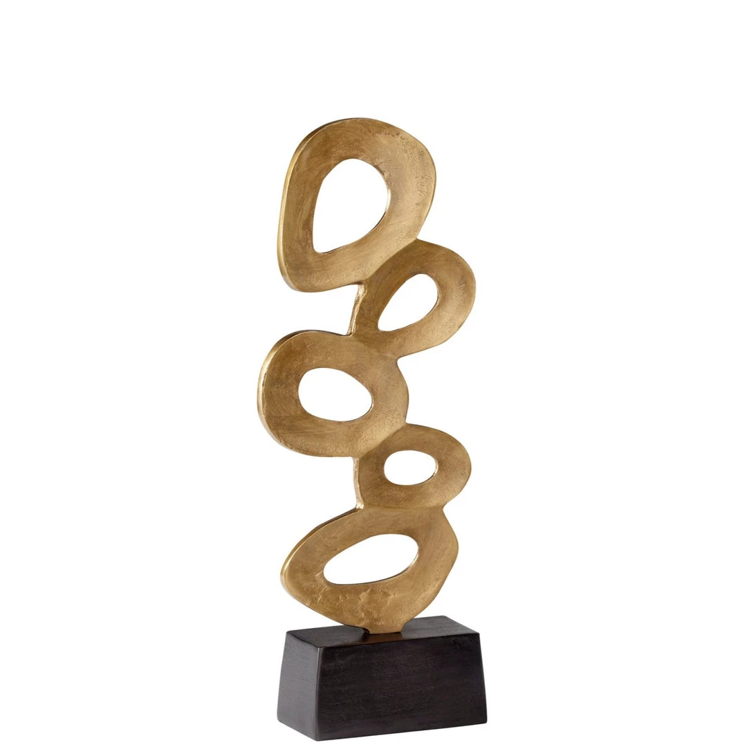 This gilded sculpture consists of several cascading concentric forms, of varying scales, that are conjoined with each other and supported by a modest dark monochrome base.