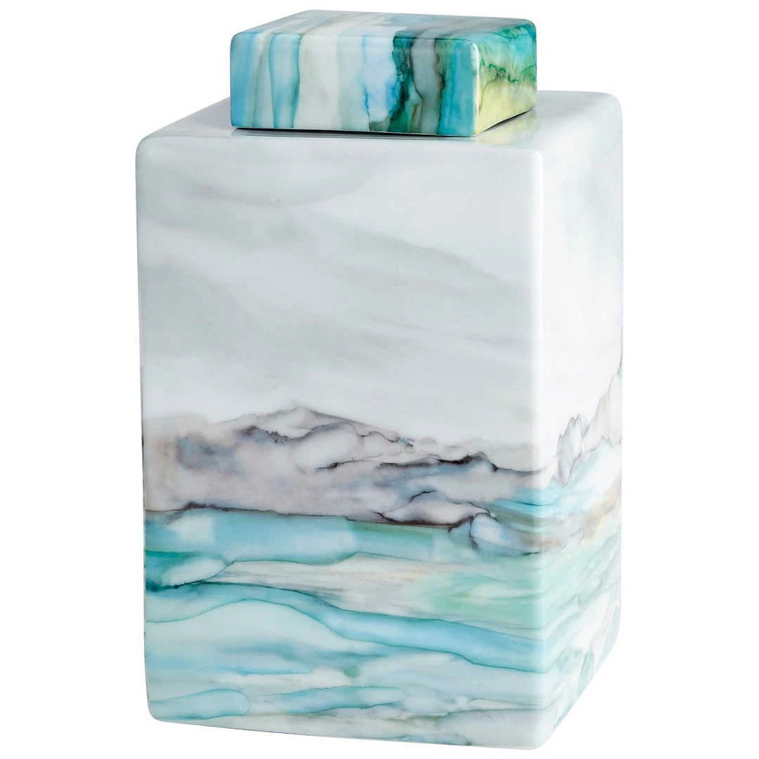 The Jade containers feature a cookie jar design with a vibrant water color effect. The fluid mix of colors features varying hues of grey, white, yellow, green, and aqua. This porcelain table top piece boasts an eccentric appeal thanks to its design inspired by abstracted landscapes, and an overall organic vibe.