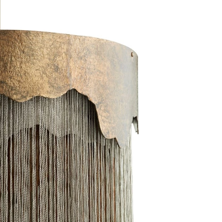 A captivating pendant that has small chains that hang down under its solid colored top shape. This lighting features many different layers as it descends toward the floor.