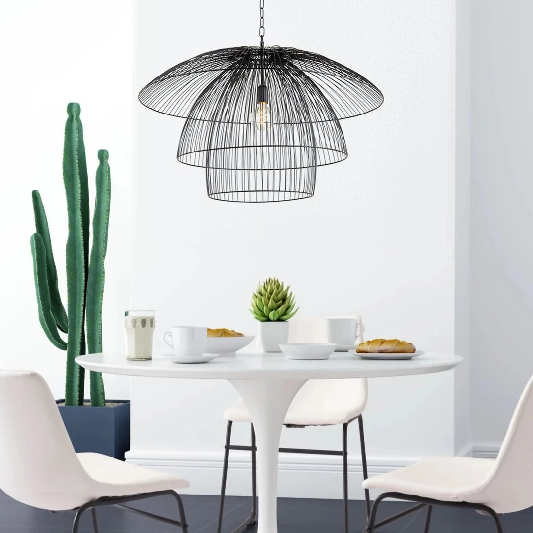 Illuminate your ensemble in eclectic style with the one-light Canopy pendant. This matte-black pendant is crafted from iron, featuring a three-tier open-frame shade that liberally diffuses light emitted from a single 60W medium based bulb. The design allows for the emission of an abundance of ambient light in every direction while offering a whimsical look fit for any modern, transitional, or boho-inspired space. Ten feet of adjustable cord gives some variety in height, allowing you to tailor to your space`s needs. Stack three over an island for a warm glow throughout your kitchen or line your hallway with a grouping for the perfect amount of light to guide your houseguests.