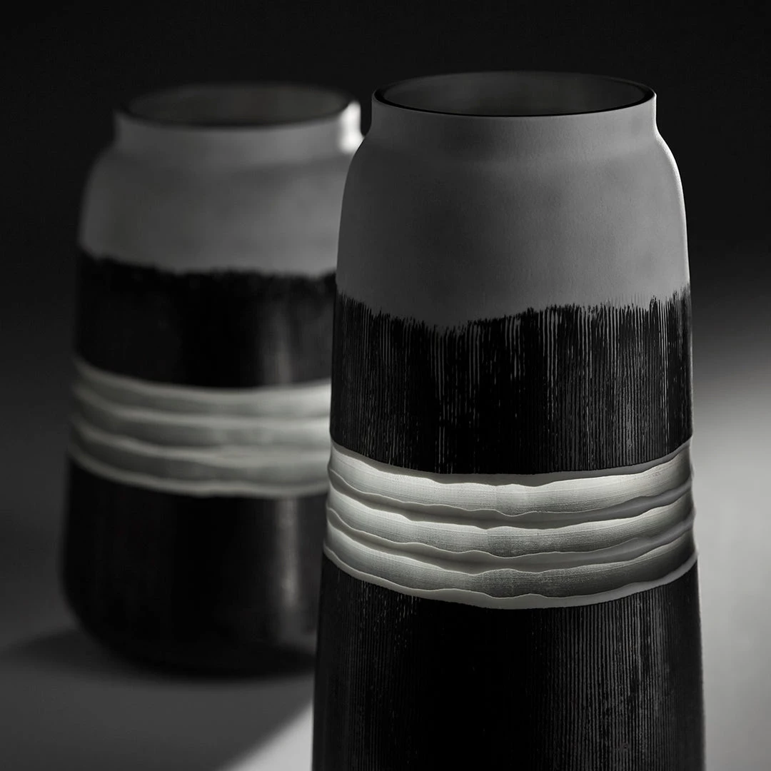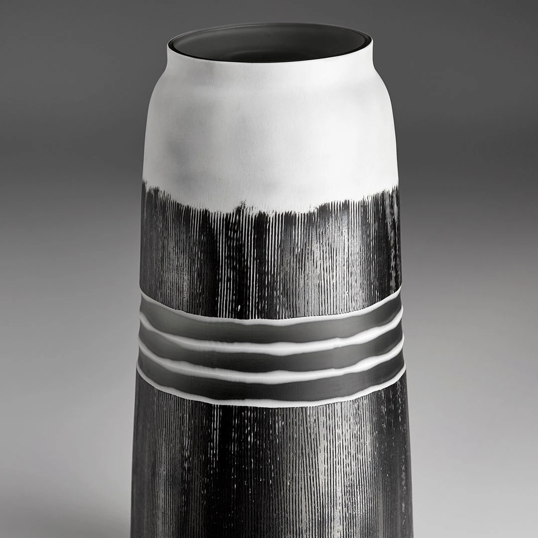 Made from high-quality hand-blown glass in a two-toned, black and white finish, the Bomeo vase features a three-stripe design spanning horizontally across the surface. Textured brushstrokes liberally cover the majority of this accent piece, adding some artistic elegance to the vessel. A beautiful addition to any decor theme, this vase will surely fill your home with whimsical style and panache. The perfect balance of design, the Bomeo vase is the ideal accessory to display on your modern entryway console, bohemian living room coffee table, or traditional kitchen countertop.