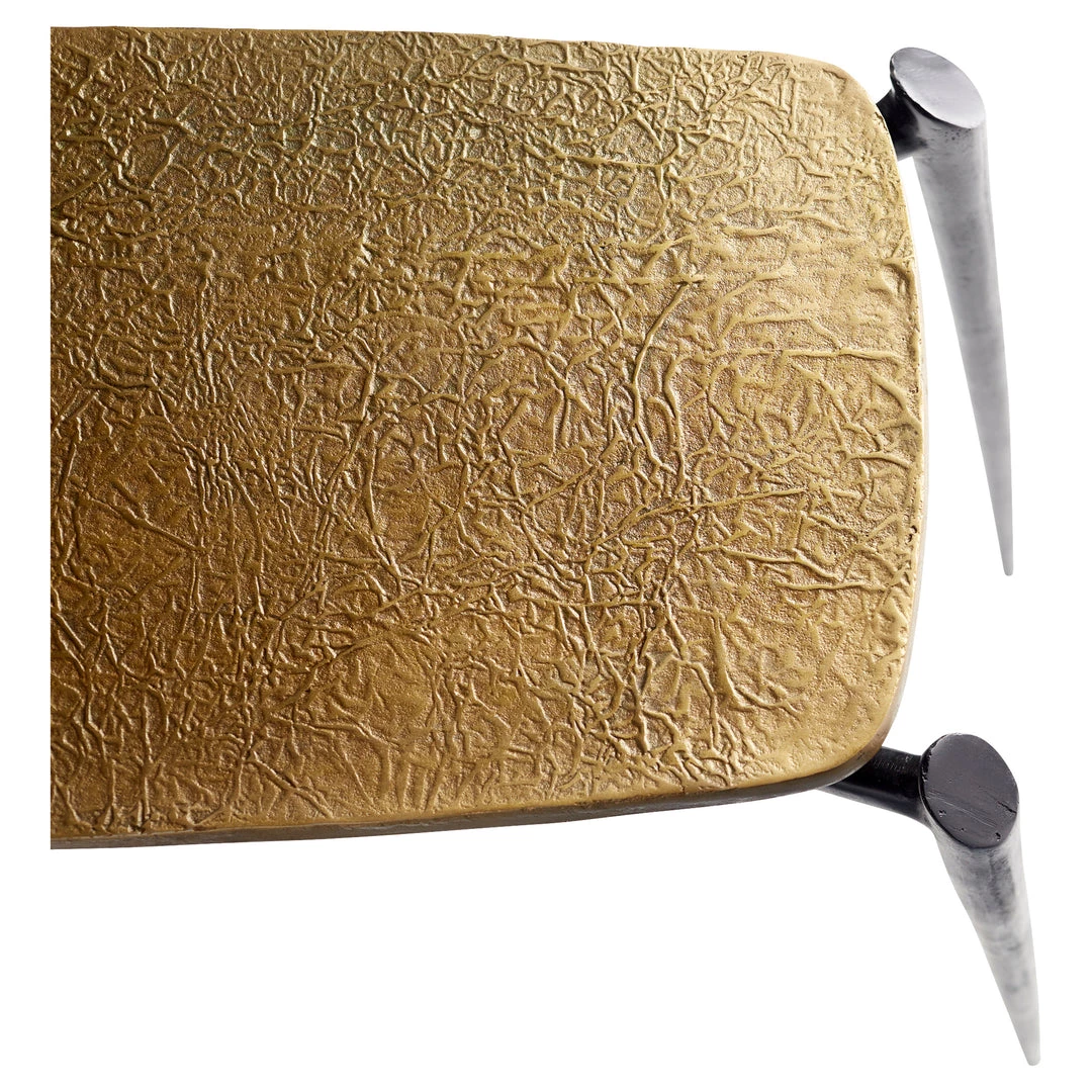 Both utilitarian and sculptural at the same time, the textured gold aluminum table top is contrastingly curvy to the acutely spiny spiked legs giving dramatic edge to this minimalist console table.
