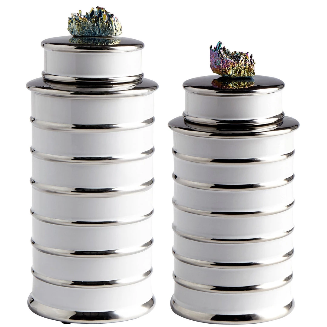 Colorful crystal accents this sleek ceramic container. Contemporary with its white and shining finish, this small container evokes skyscrapers in modern cities.