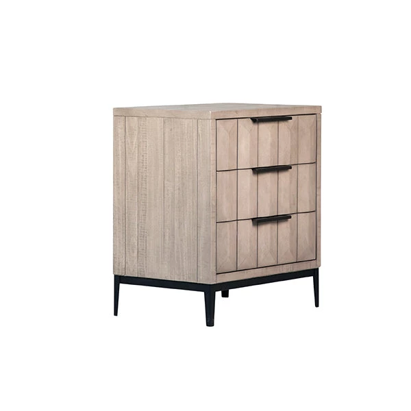Stately style. Geometric pine wood panels in a light grey wash brings a fresh textural look to bedside storage.