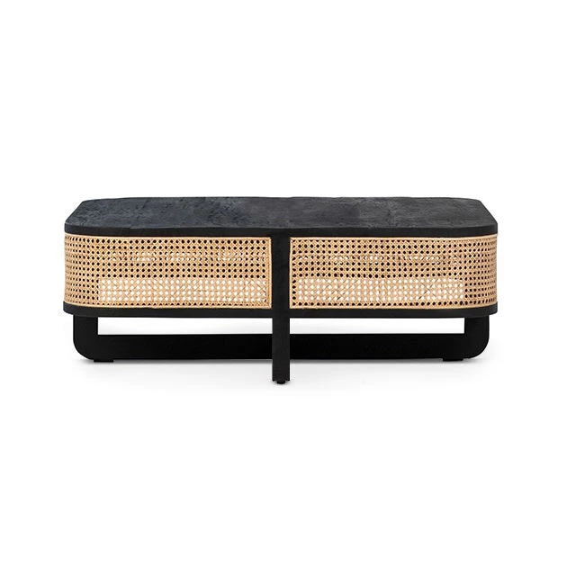 A lovely material mix. Made from mixed hardwoods in a sophisticated black finish, the soft-squared tabletop is rounded with natural cane paneling bringing mid century-spirit to the modern coffee table.
