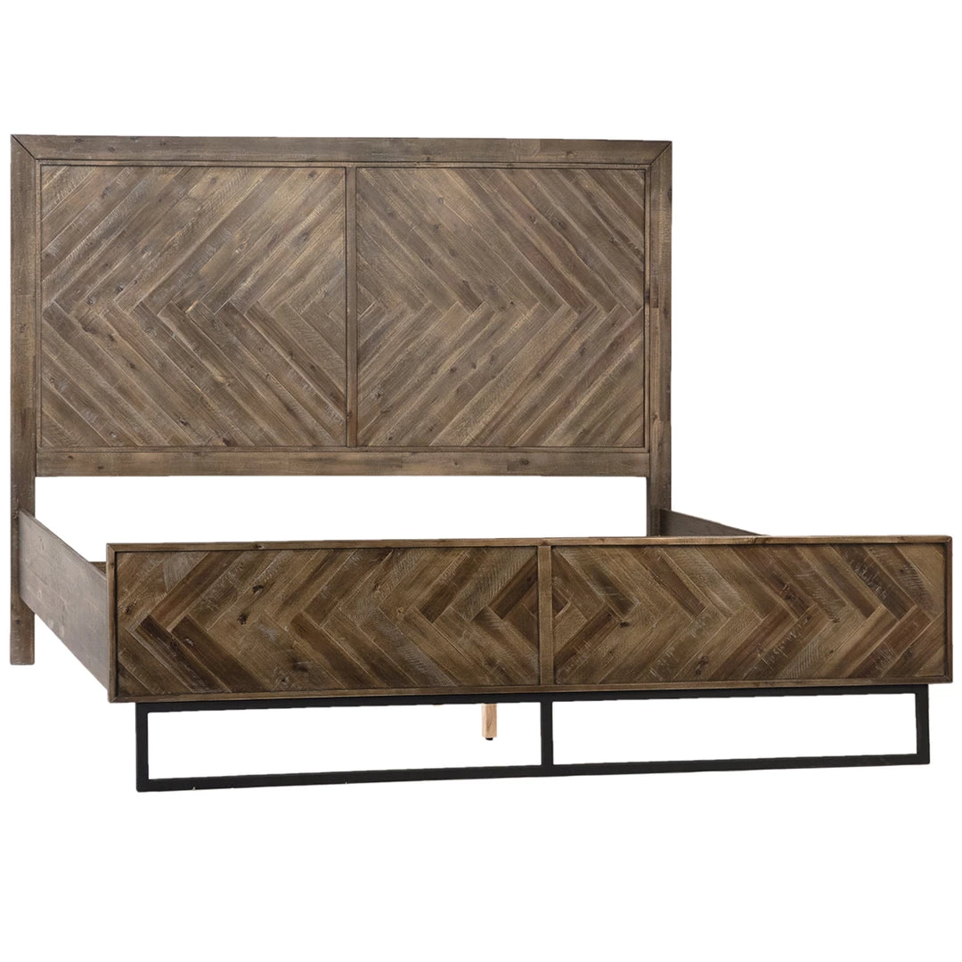 Rich, antique brown-finished acacia adopts new edge in this panel bed designed for both rustic and modern spaces alike. Acacia planks laid in a chevron pattern highlights the natural wood graining while creating an eye-catching central focus.