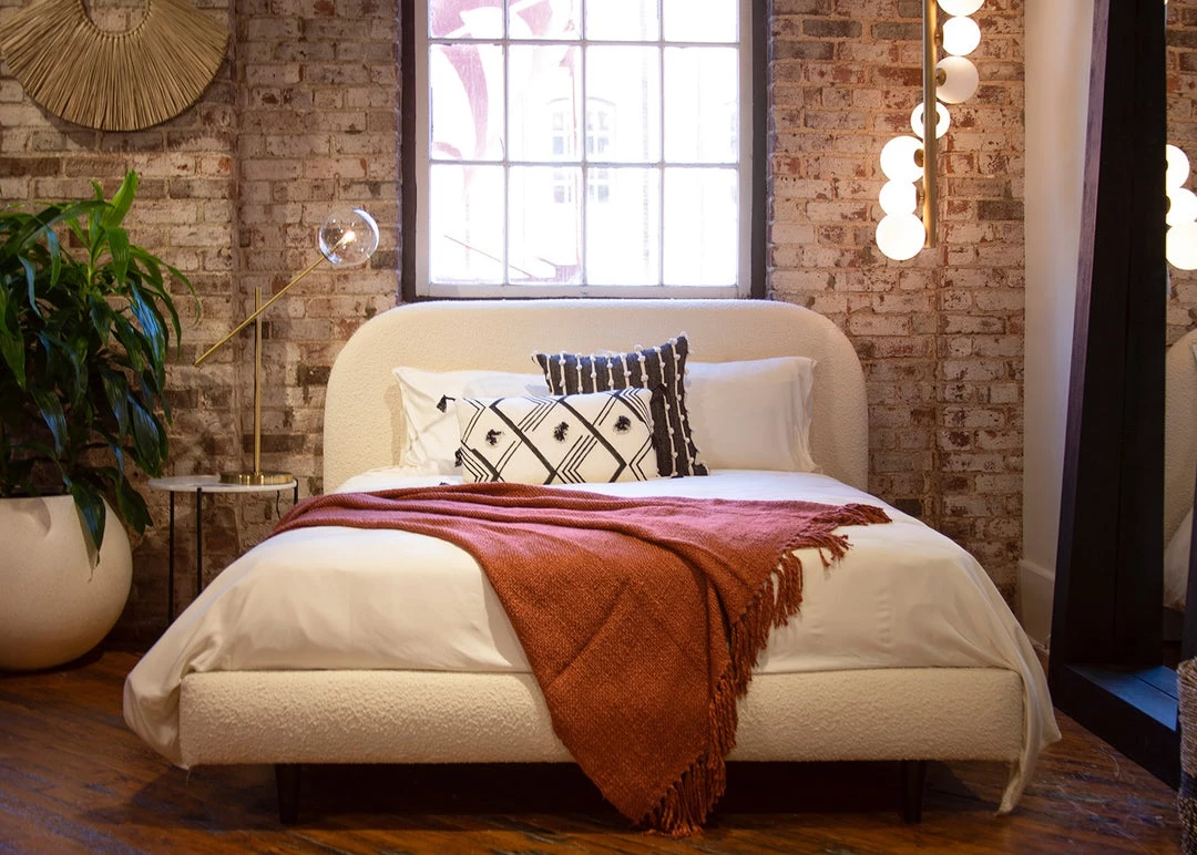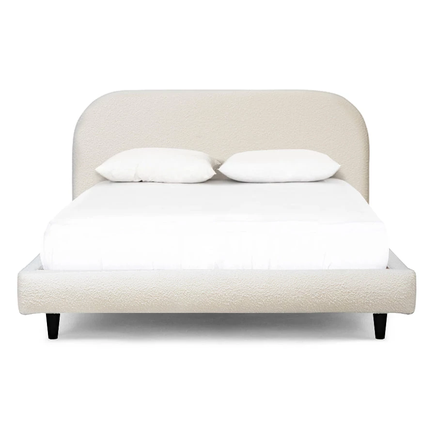 Lushly inviting with a perfectly padded curved silhouette, the low-profile Marley platform bed is upholstered in a soothing off-white bouclé bringing modern texture to bedroom styling.