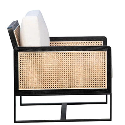 Mixed materials refresh retro Palm Springs inspiration. The boxy ebony oak wood frame provides perfect contrast to the textural inlayed panels of natural cane. The white cotton seat cushions are removeable for easy care making the Vizcaya Cane Chair both a stylish and sensible seating option.