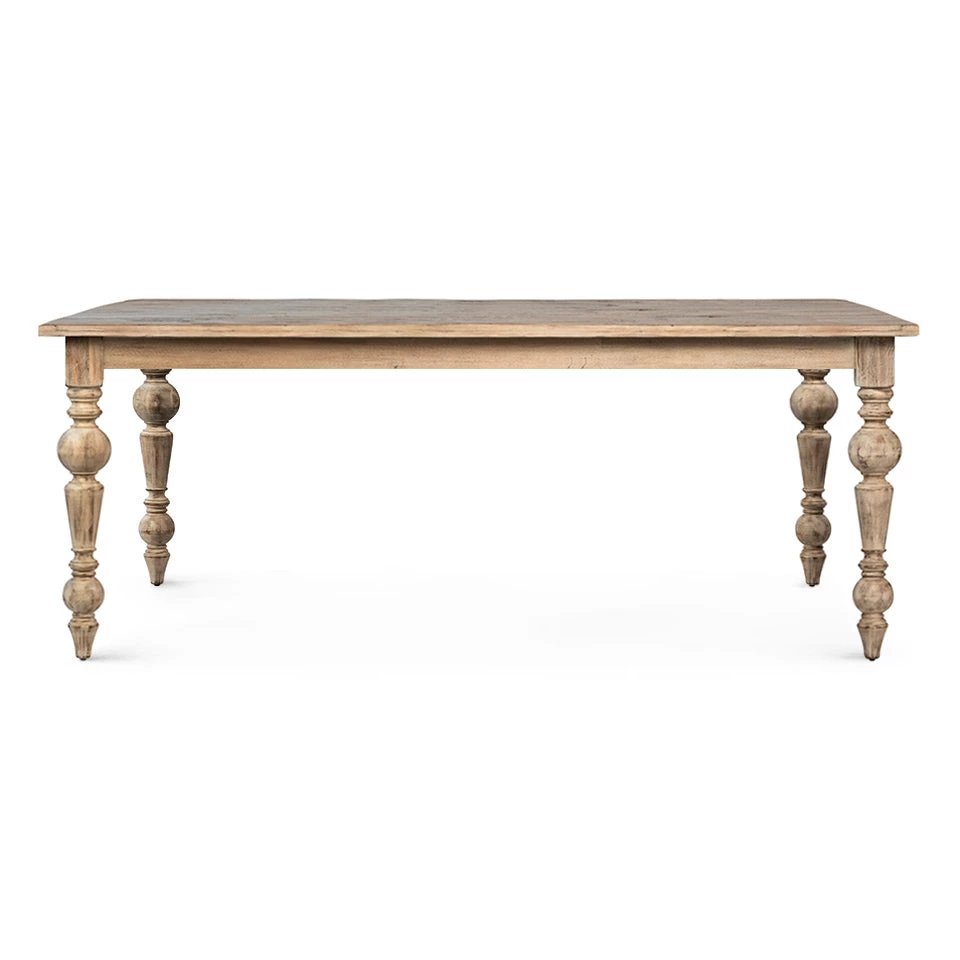 The Idella Dining Table has an elegant form crafted from reclaimed acacia wood in a vintage warm wash finish. Hand turned legs bring a sculptural element to the piece and add to its lived-in charm.