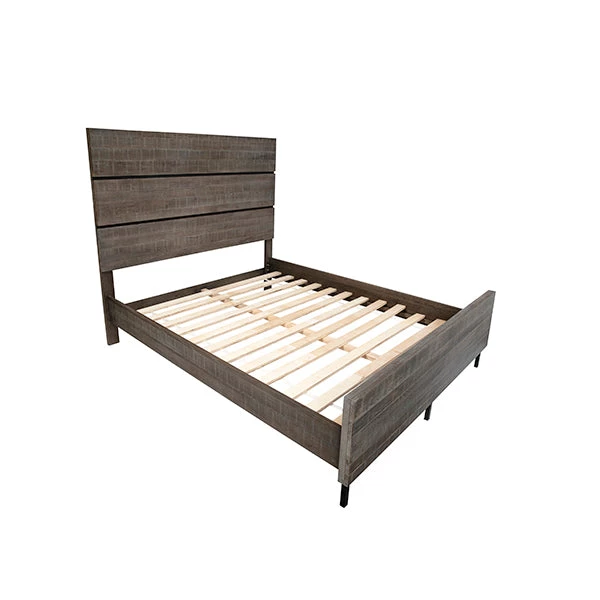 This bed gives a modern rustic farmhouse vibe. The panels are hand distressed and finished with a dark grey wash leaving the natural oak wood highlights coursing its entirety.