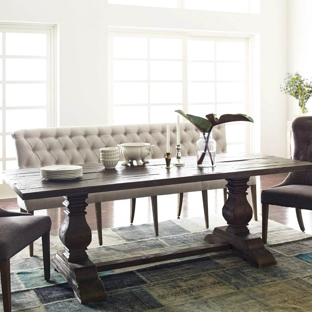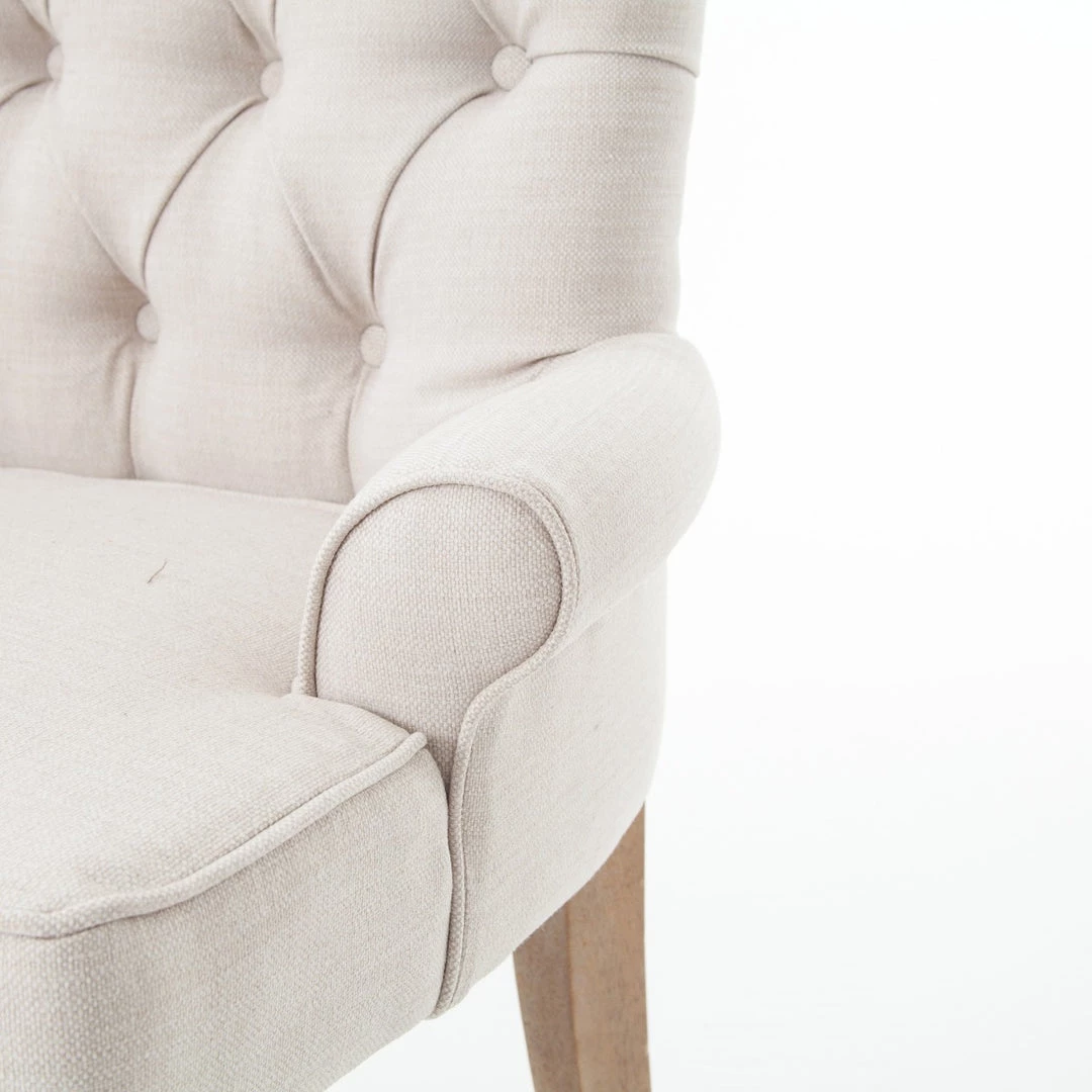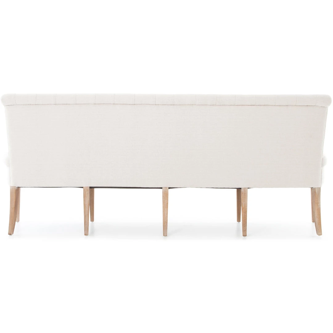 A classic long banquette with traditional deep tuftng, soft curves, splayed legs, and a contemporary casual light sand upholstery perfect for the modern eclectic setting.