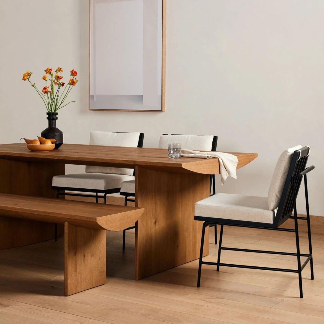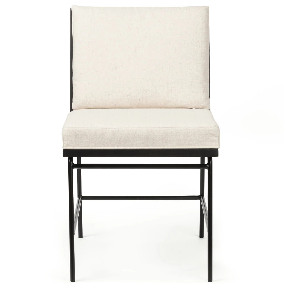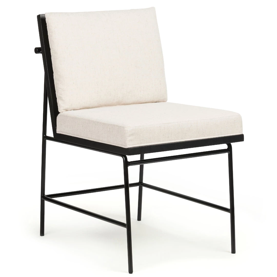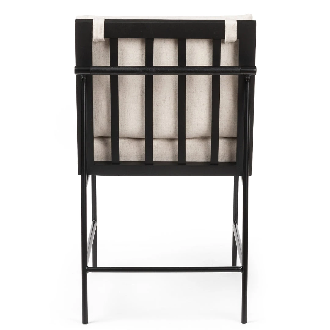 A perfect mix of materials come together in this structured design. Slim, black-finished iron frames a floating ladderback of brushed ebony-finished parawood and topped with cream-colored linen-blend seating. Rear handle detail adds a fashionable finishing touch.