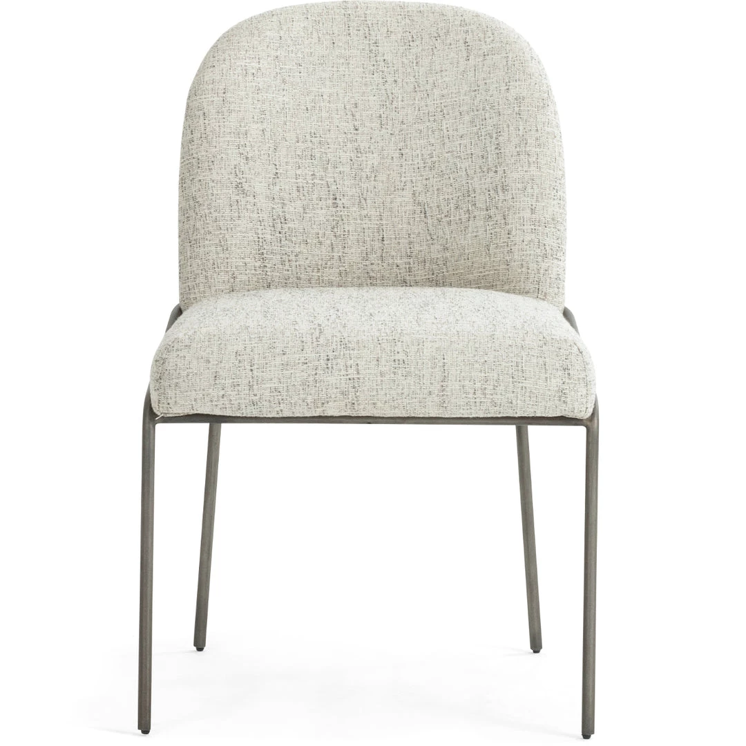 Perfect for the modern-minimalist looking for casual comfort style. This dining chair features an armless design with an elegant, two-piece upholstered seat, resting effortlessly in a tubular metal frame. Covered in an creamy tonal fabric with taupe stone hues.