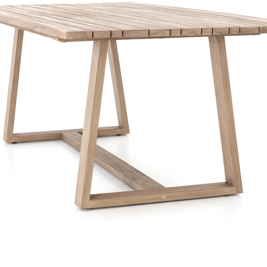 An angular base brings architectural appeal to this dining table, while the teak wood planks provide plenty of table space, perfect for outdoor entertaining.