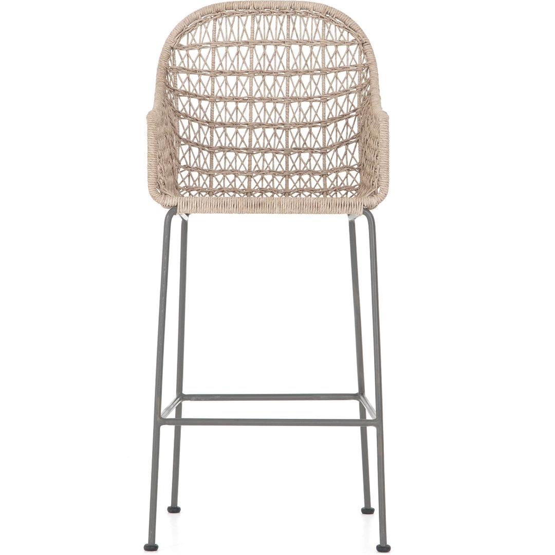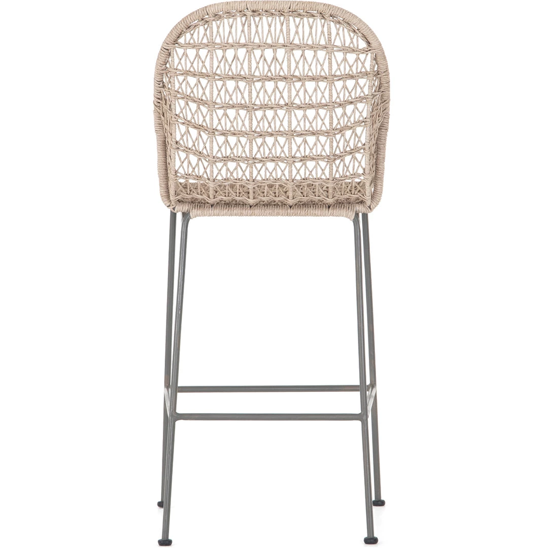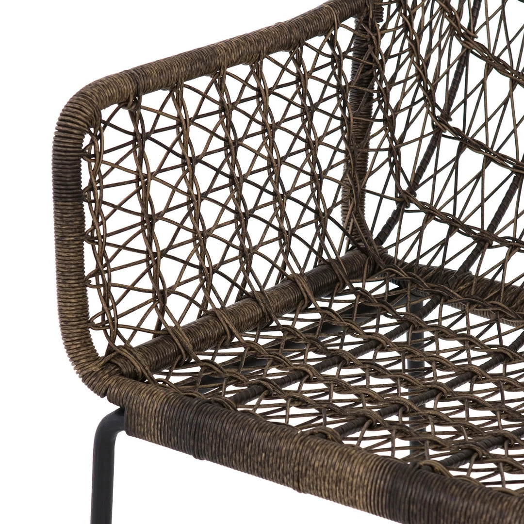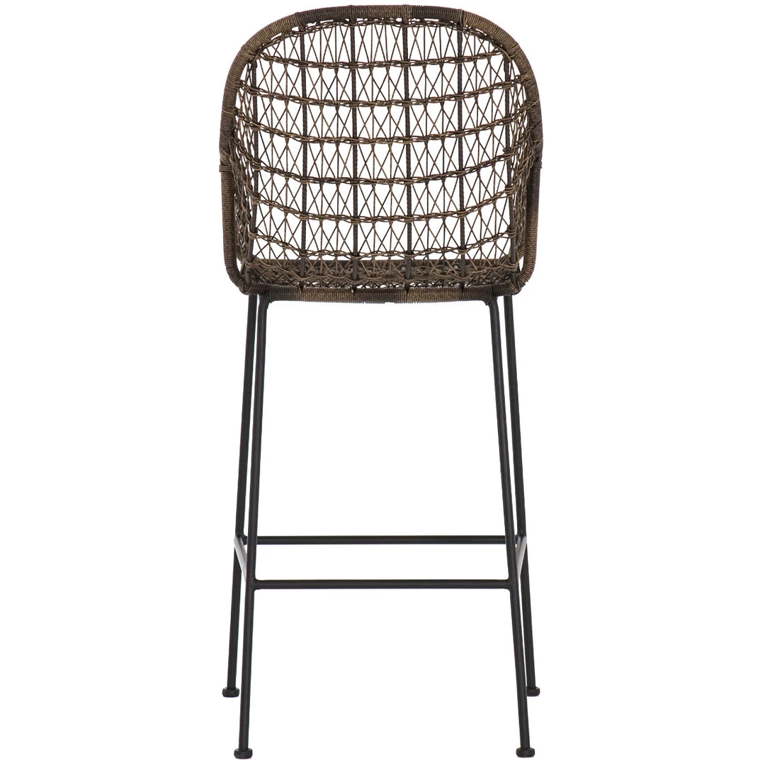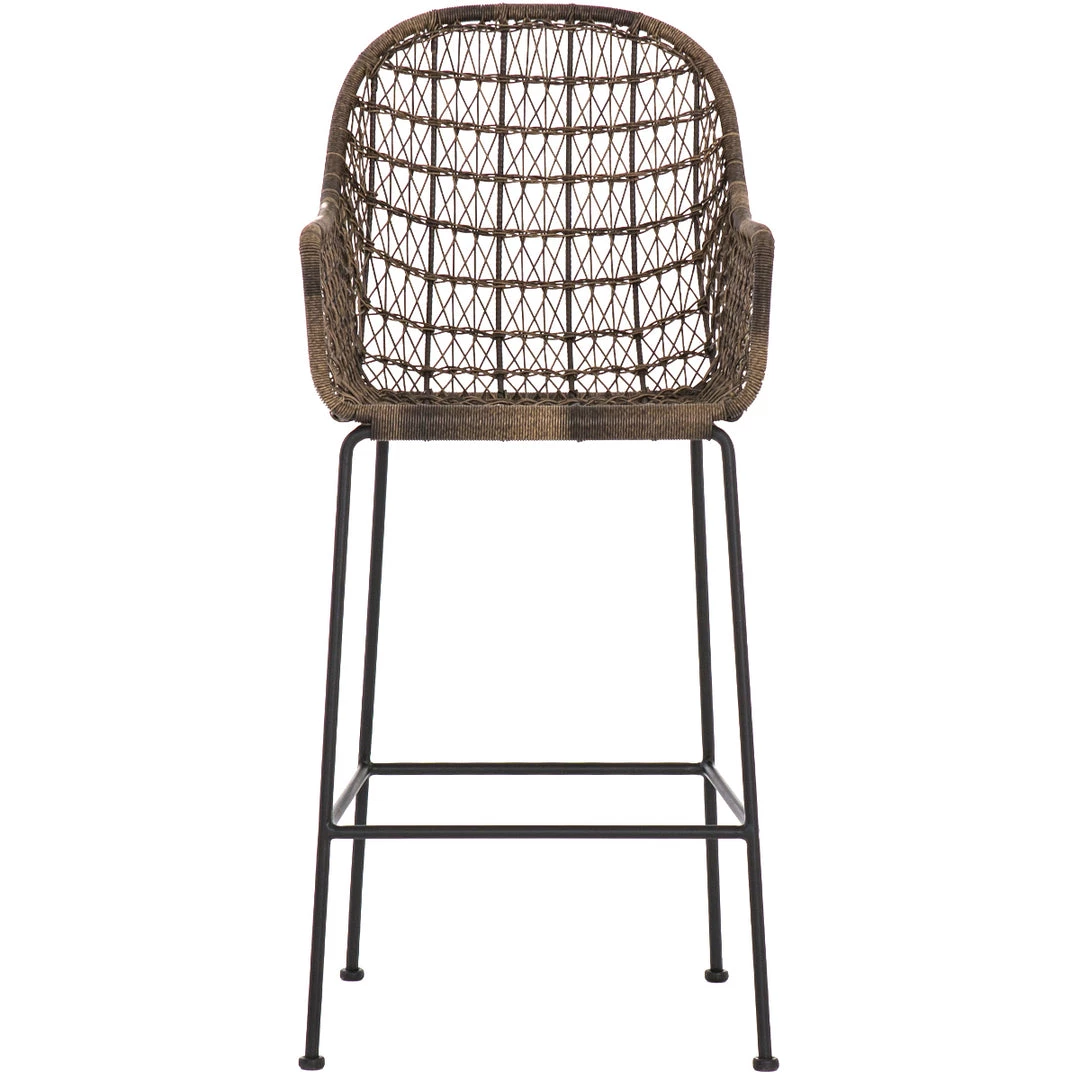 This low-armed woven synthetic wicker bar chair features a molded and contoured seat forming a net-like style that will capture your love instantly. Supported by a contrasting black iron base, this organic modern dining stool works indoors or out.