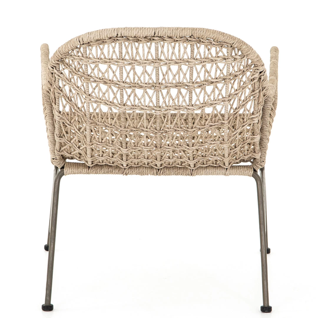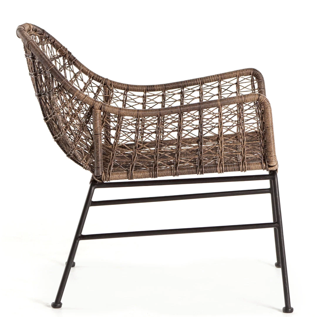 Clean, contemporary shaping and an updated weave transform all-weather wicker into something modern. This take on the club chair is supported by a contrasting iron base.