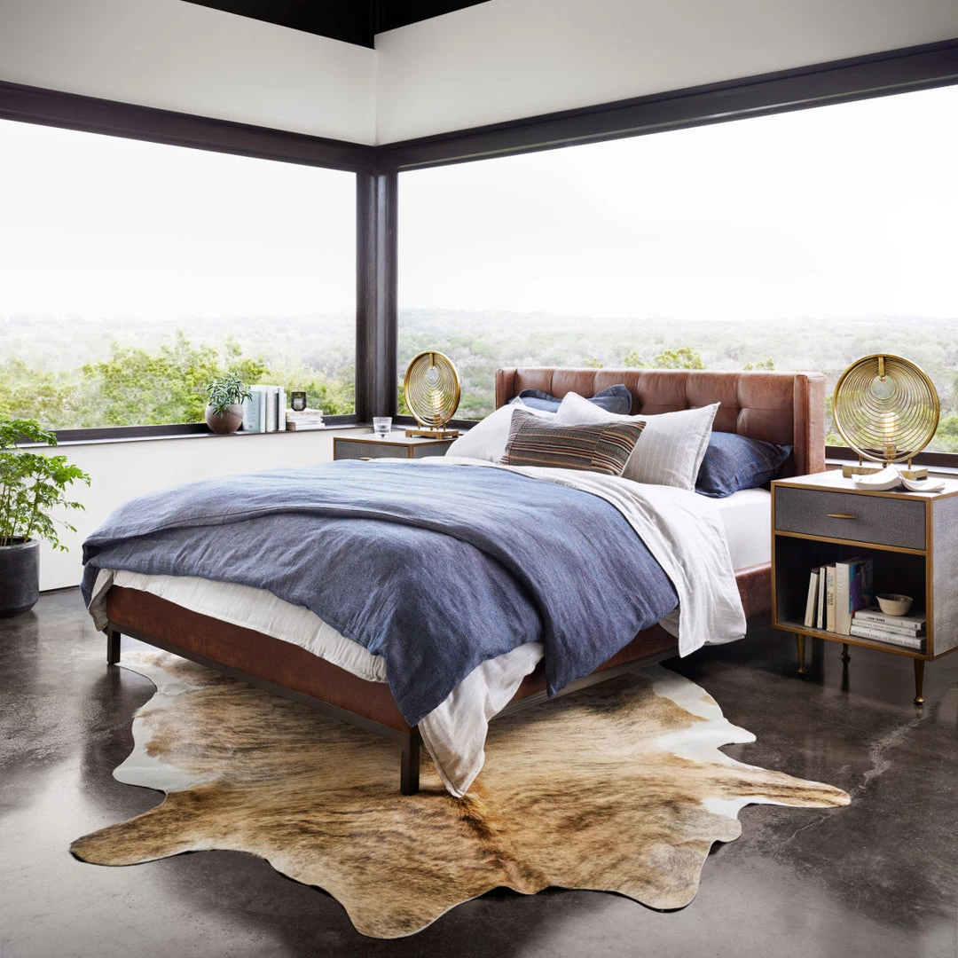 This mid-century modern one-drawer night stand is covered in gray resin faux shagreen and trimmed in antique brass for contrast. Set on tapered metal legs, Andel features an open shelf design to display your favorite books and accessories.