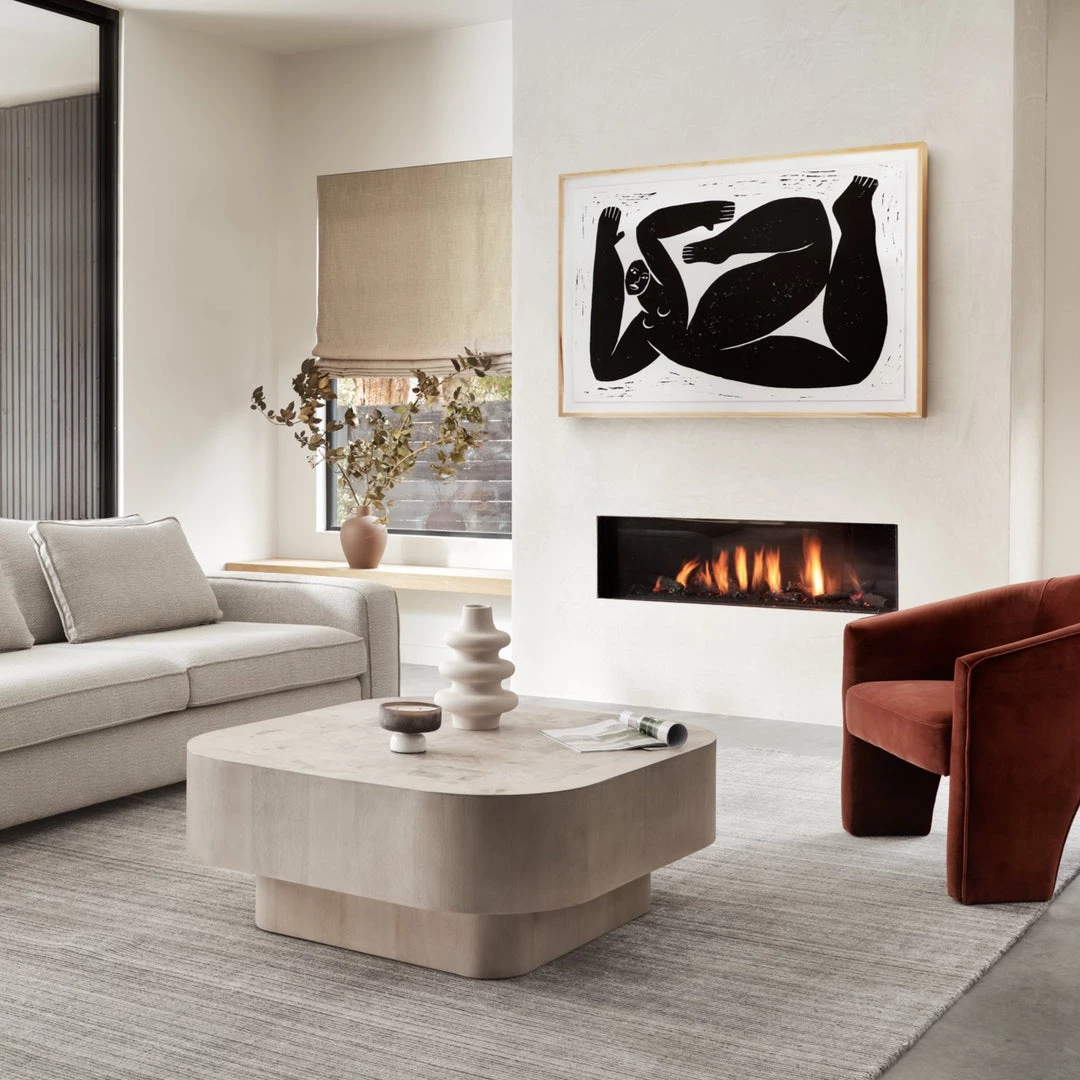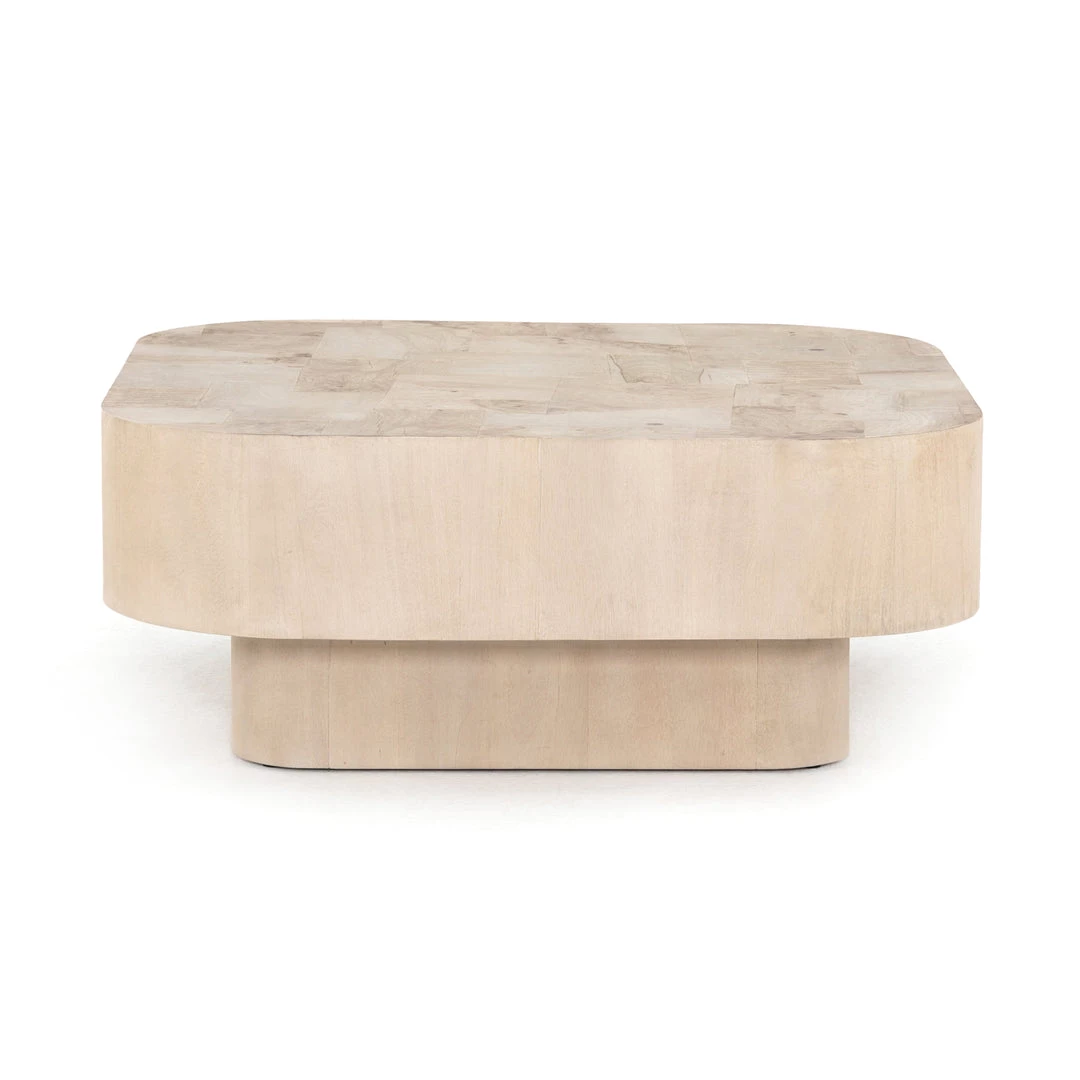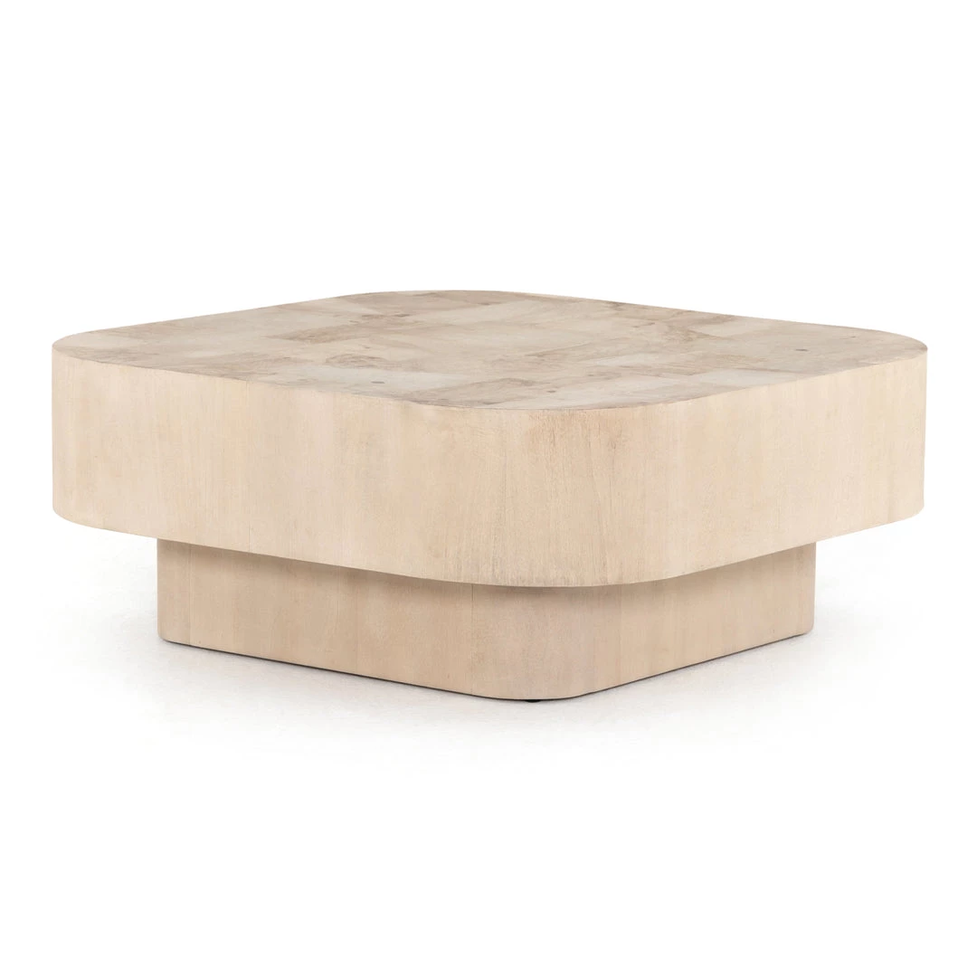 Lighten up. Made from bleached ash burl, a soft-squared tabletop features a patchwork pattern to bring novel movement to the modern coffee table. Finished in an ashen walnut, mahogany veneer sides and an inset base complete a beautifully light look.