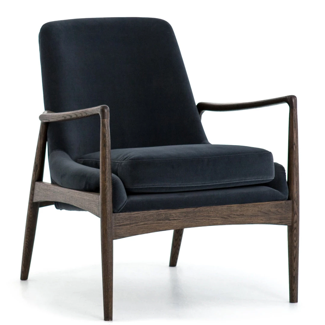 Dramatic arms and deep seat offer relaxation with mid-century modern sophistication. Sculpted cedar frame adds an architectural feel to soft velvet upholstery.