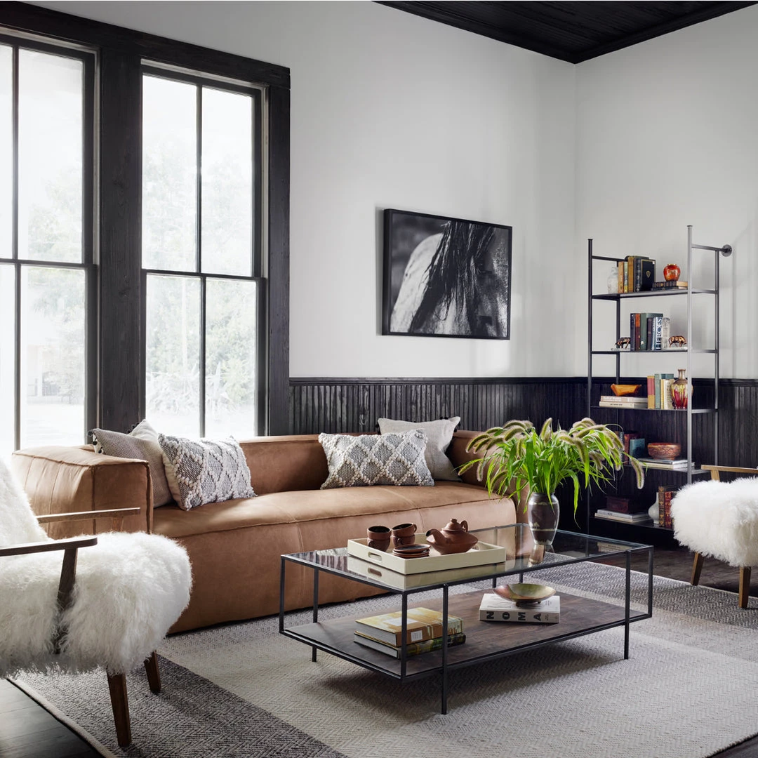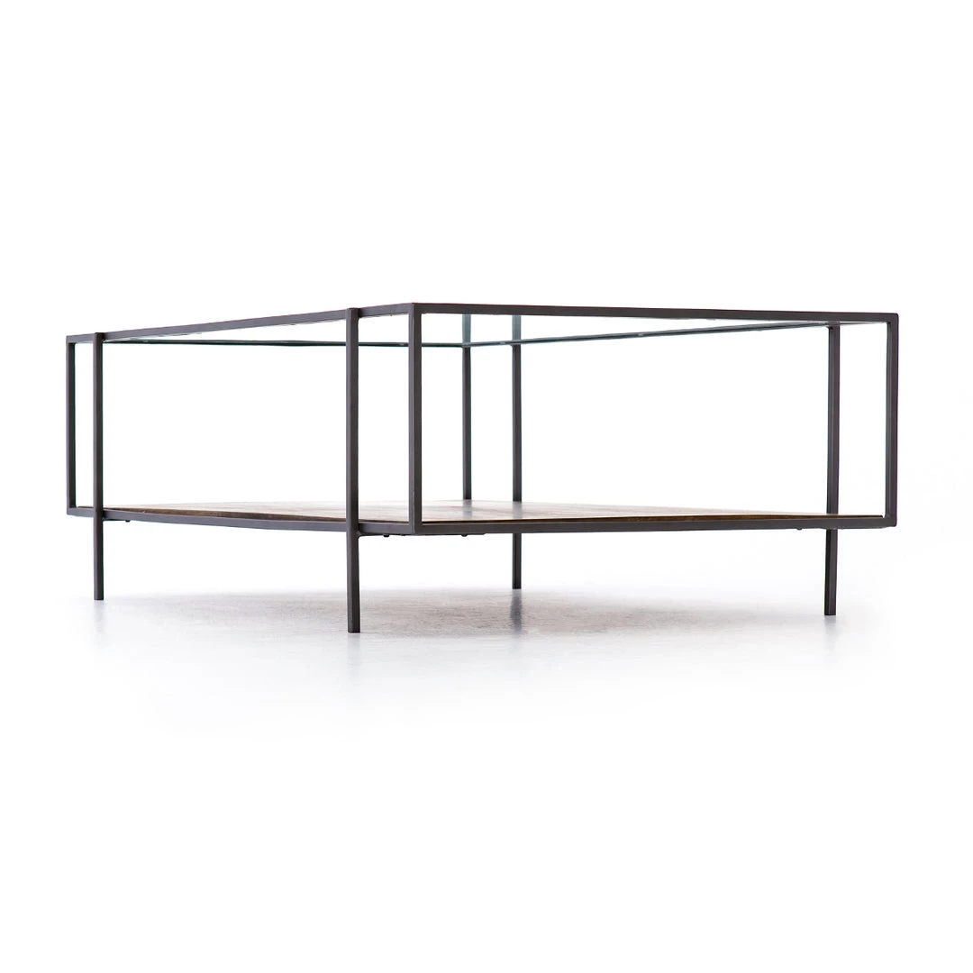 Mixed materials refashion simple design into this modern industrial coffee table. Slim, iron framing supports a mango wood shelf and clear tempered glass top. Perfect for styling with your favorite reading materials and decorative accessories.