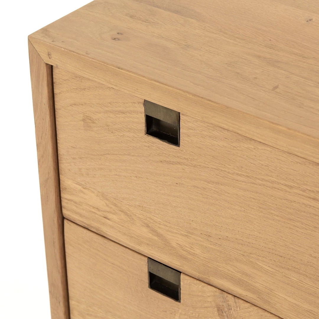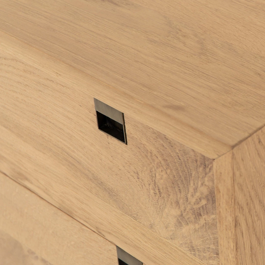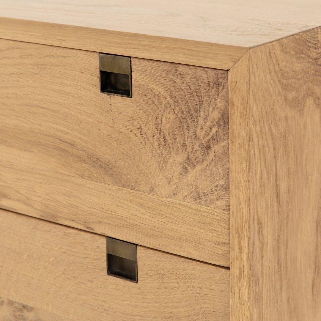 Style meets simplicity in this Danish-inspired design. Five drawers of solid natural oak welcome squared iron hardware in a satin brass finish, bringing ample storage space to the bedroom.