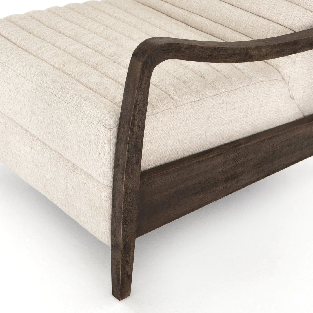 A dramatically shaped mid-century frame meets with on-trend channel tufting. Pale, neutral upholstery contrasts with dark sienna brown parawood. A push recliner takes this forward-thinking lounger to the next level.