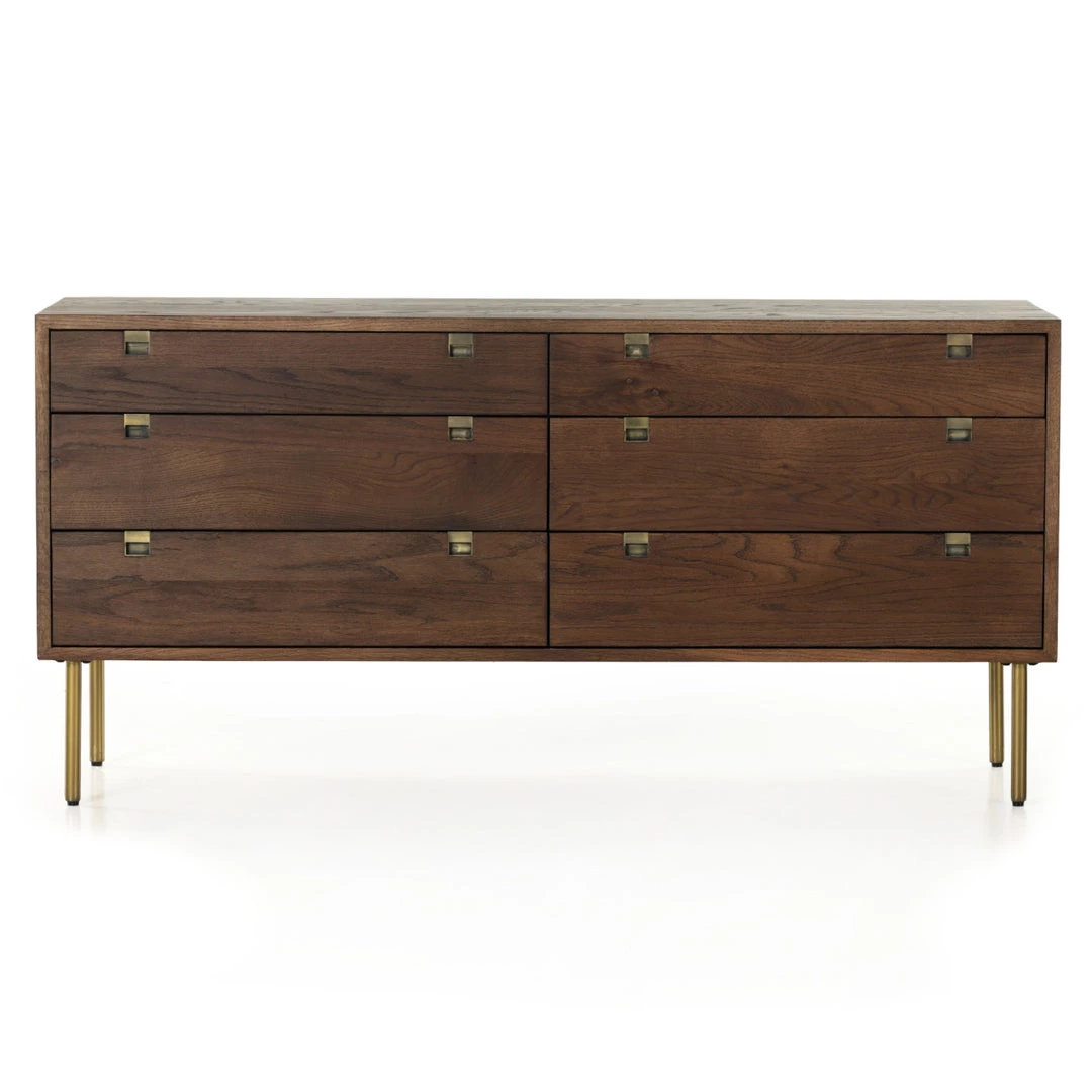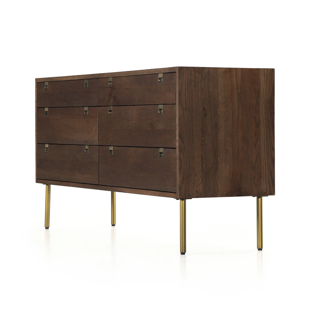 Style meets simplicity in this Danish-inspired design. Crafted from solid oak in an umber brown finish, six drawers welcome squared iron hardware in satin brass, bringing ample storage space to the bedroom.