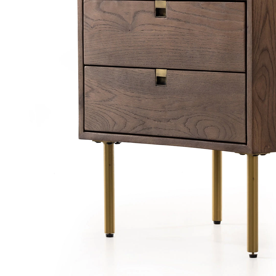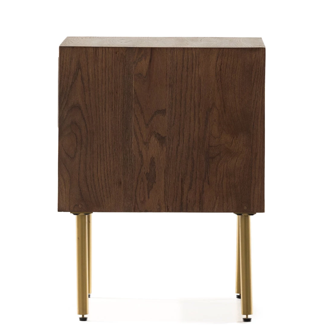 Style meets simplicity in this Danish-inspired design. Solid oak in a rich umber brown welcome squared iron hardware in a satin brass finish , while the dual drawers offer plenty of storage for your bedside essentials.