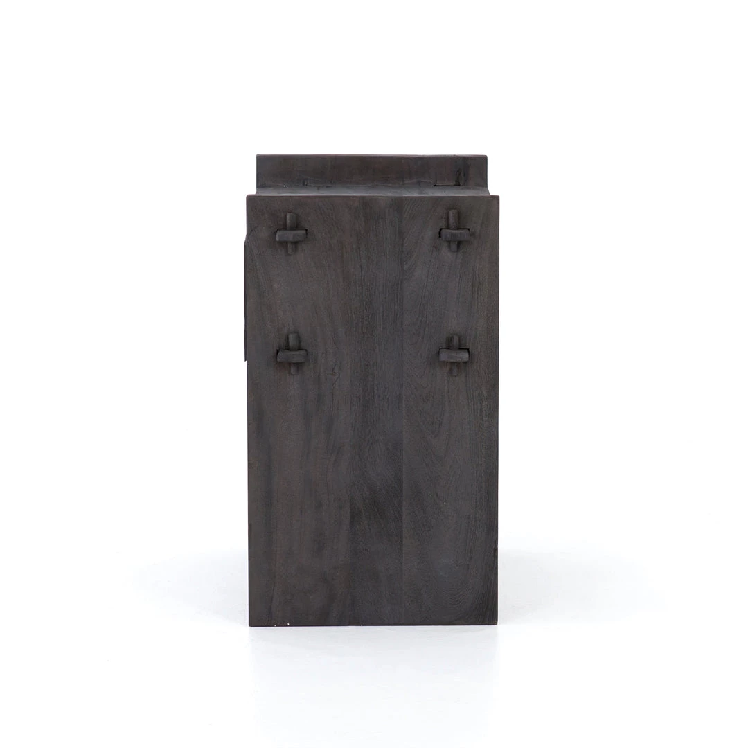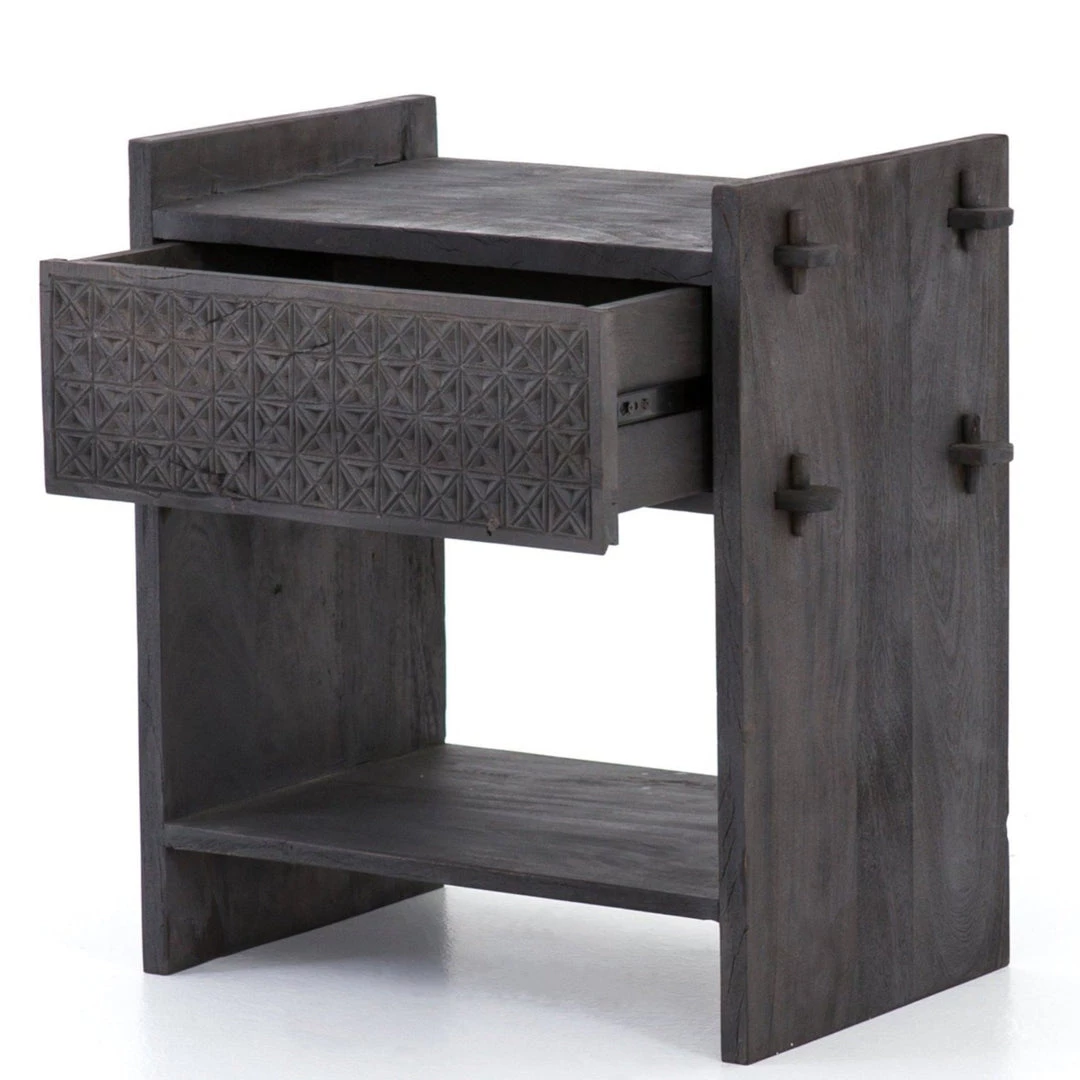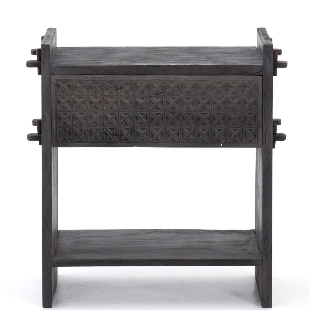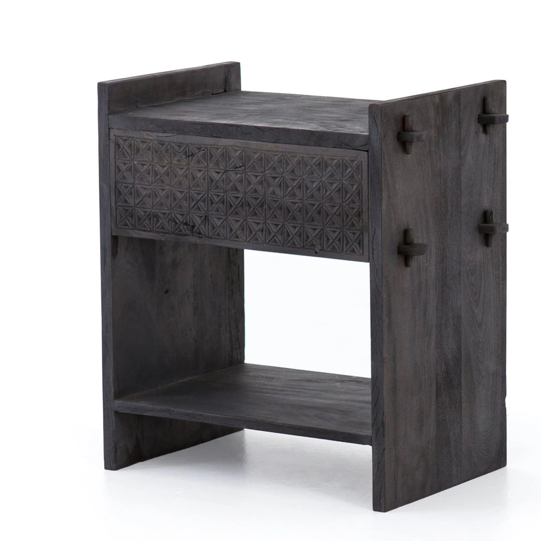 Inspired by authentic Indian antiques, intricate hand carving delivers a modern air to bedside storage via fresh geometric patterns. Due to reclaimed woods’ organic essence, character cracks are natural and play up materials’ inherent allure.
