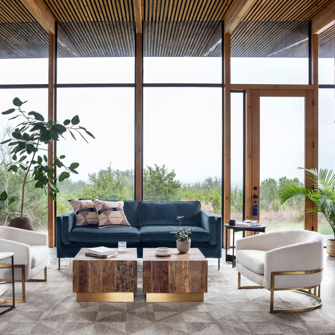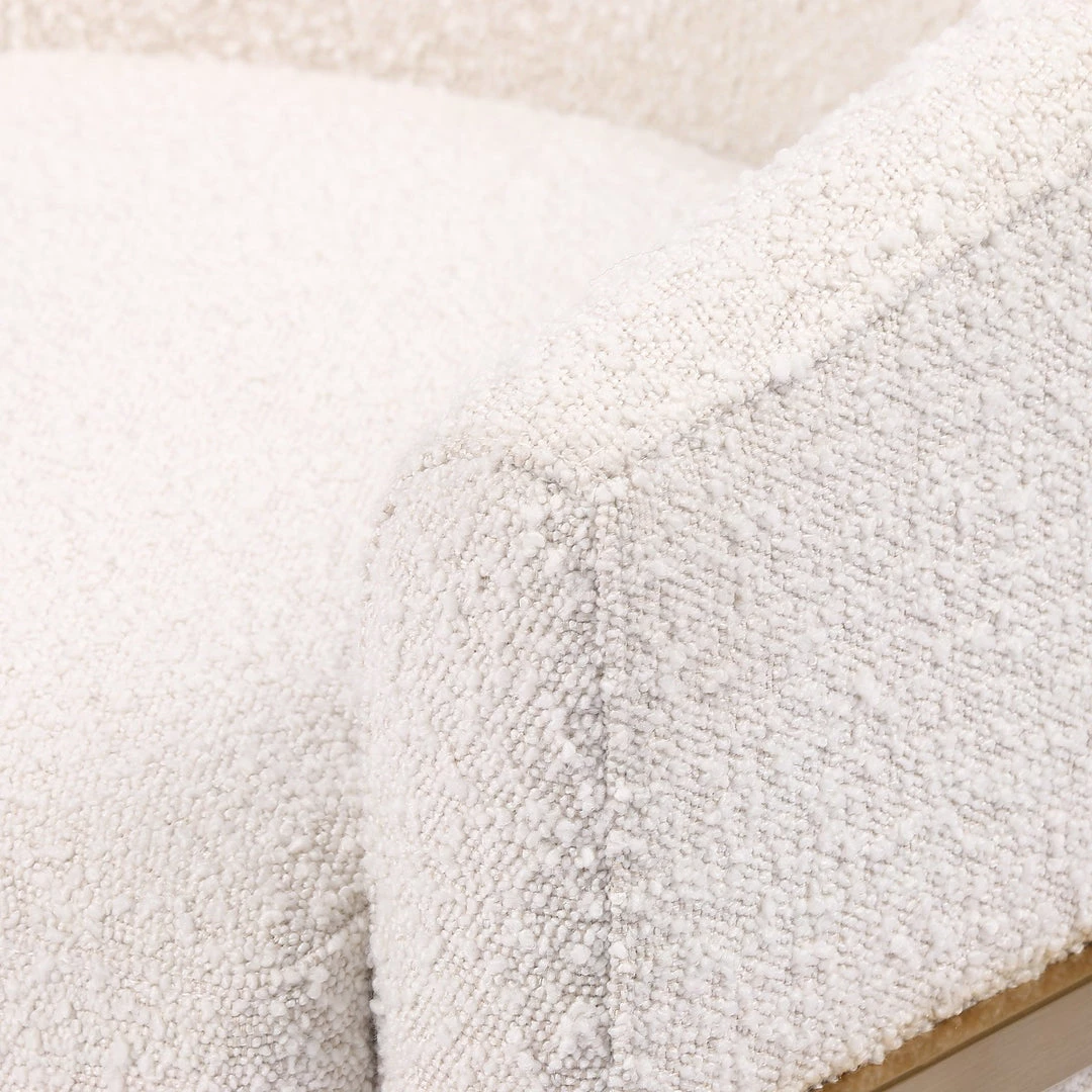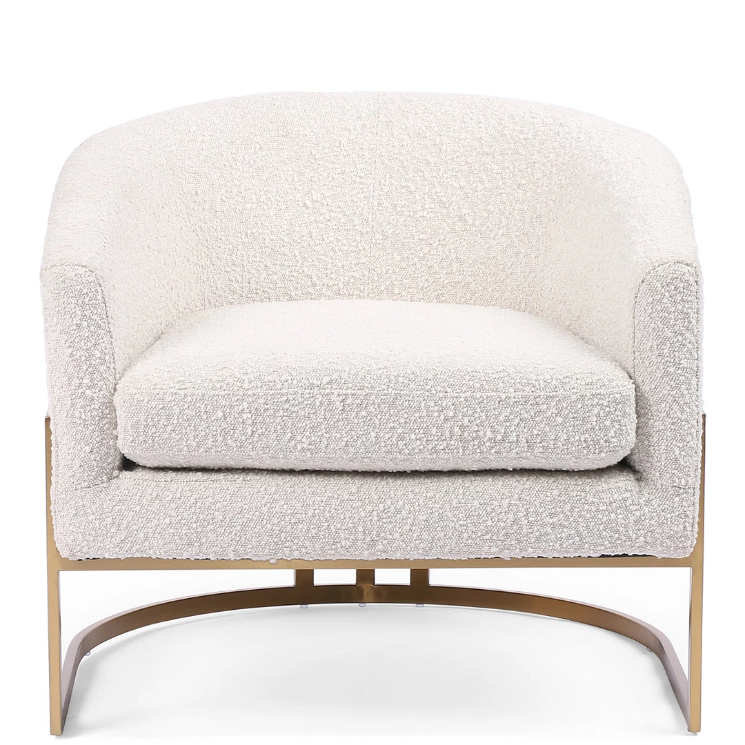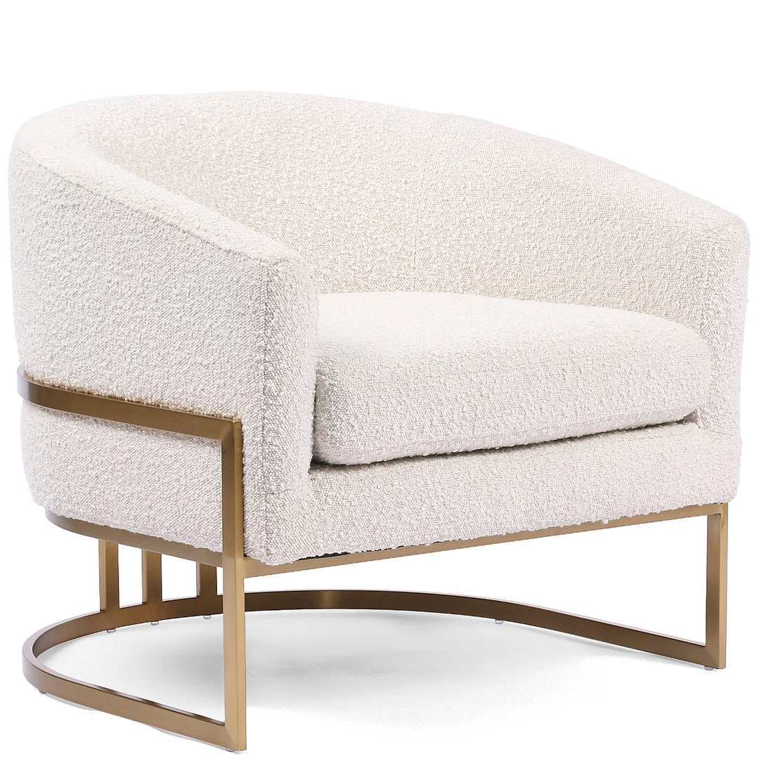 Mid-century-modern with subtle swank describes the Corbin Chair. Cream poly-blend upholstery lends a boucle-like feel and luxe look, while the satin brass-brushed metal frame accent its seductive curves.