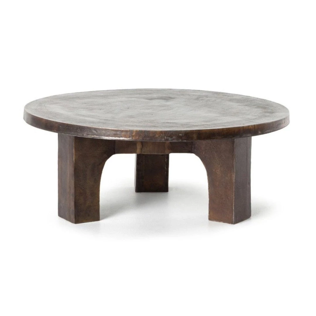 A brutalist-inspired table featuring all aluminum in a rust antique finished smooth surface. Each piece is unique and variations in mixed proportions to be expected.