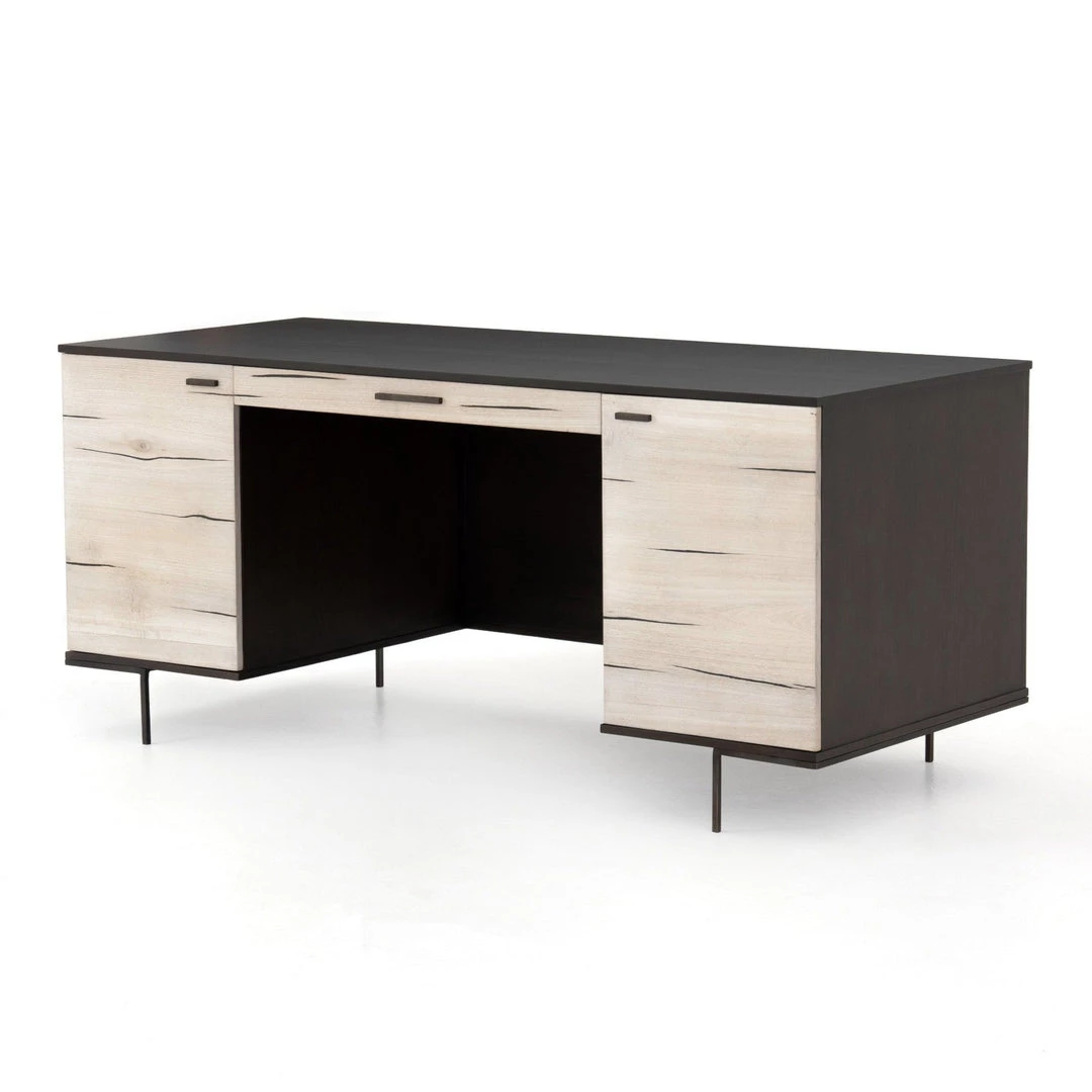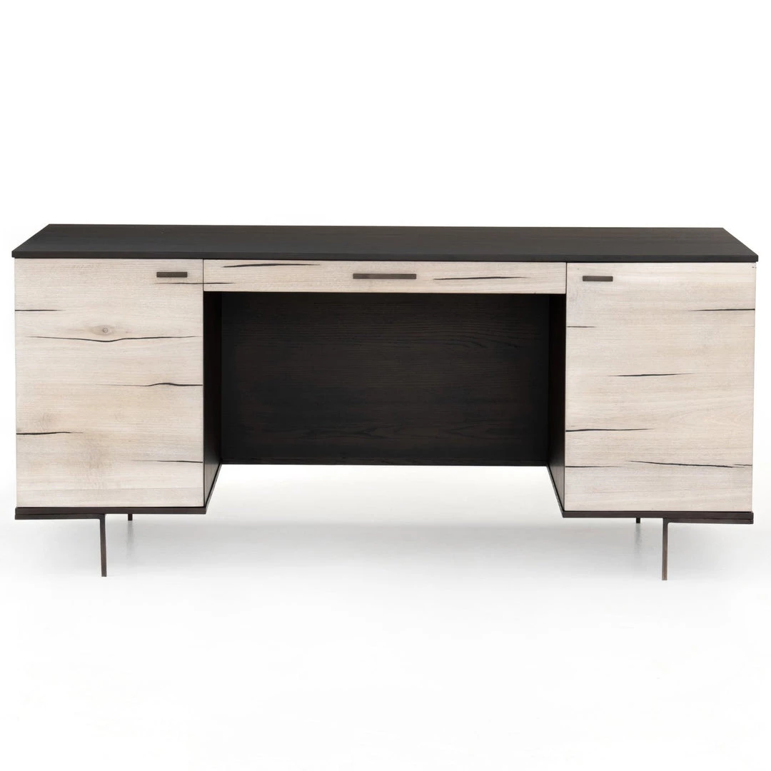 Slender legs of gunmetal-finished iron support a black ash frame, as resin fills the natural graining of bleached yukas. Center drawer and side cabinetry offer plenty of space for convenient office storage. Pattern and depth of resin lowlights and highlights vary from piece to piece, due to wood species’ inherent nature.