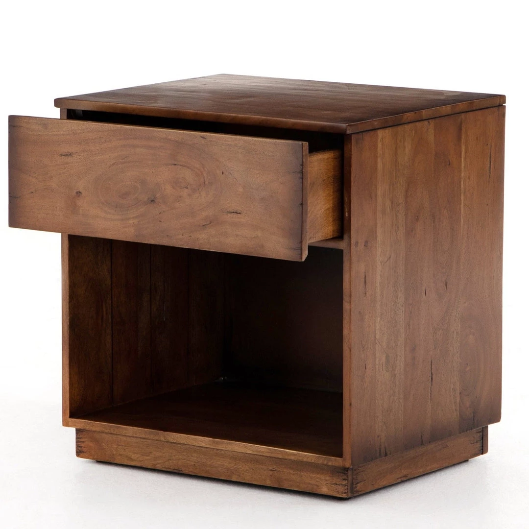 Organic in nature with mid-century undertones. Solid acacia forms a streamlined nightstand, with a single drawer plus lower shelving for handy bedside storage.
