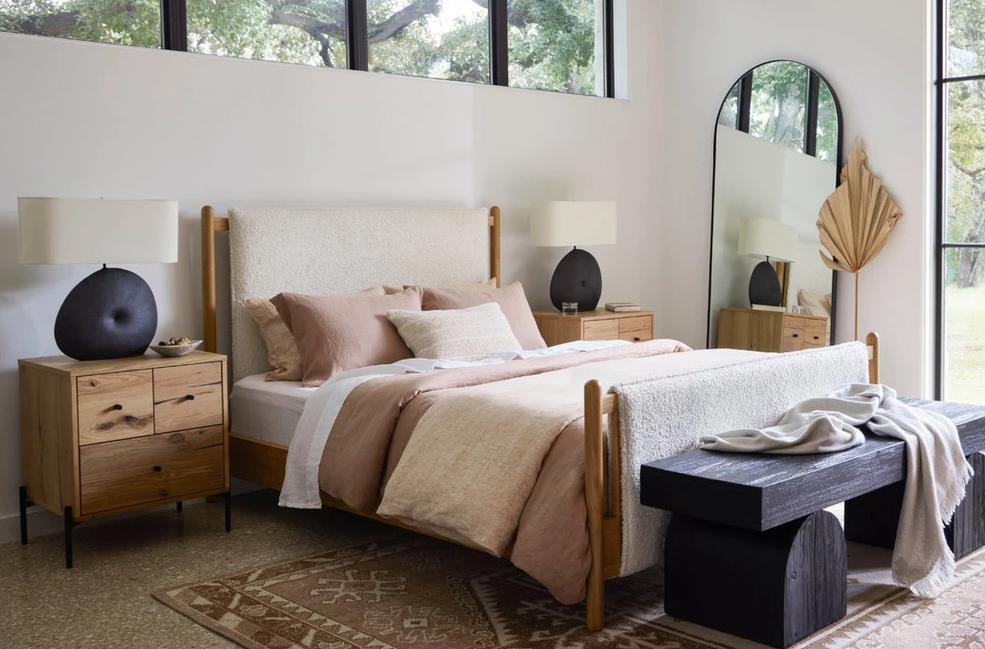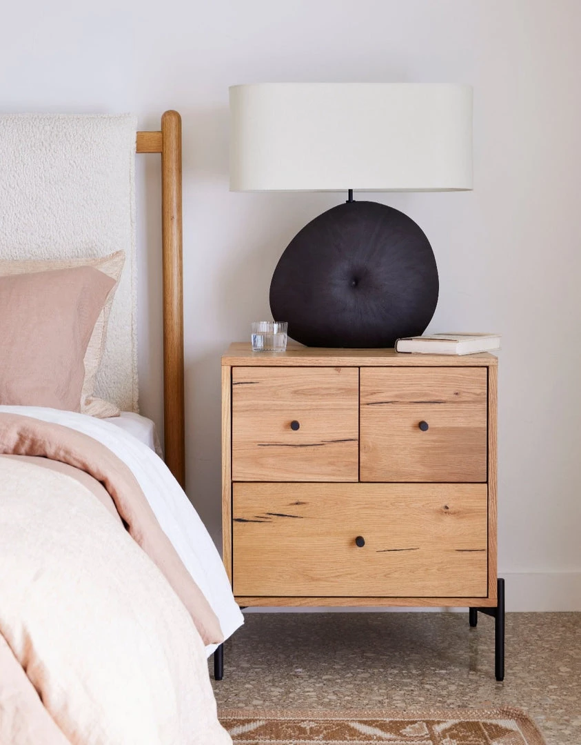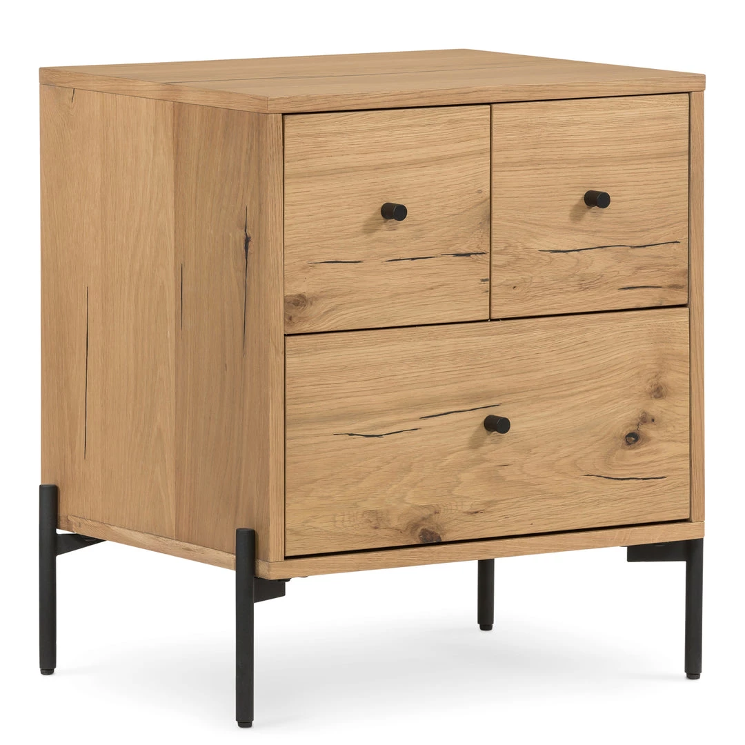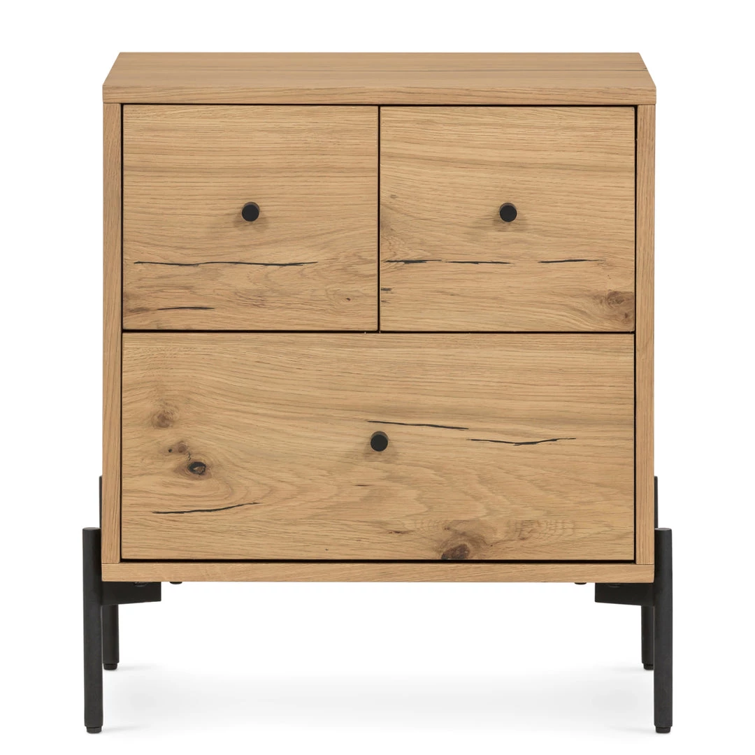 Clean and streamlined. Light-finished oak features three drawers plus gunmetal-finished hardware, for a crisp look that’s always in style. Dark resin plays up natural graining for texture and authenticity.