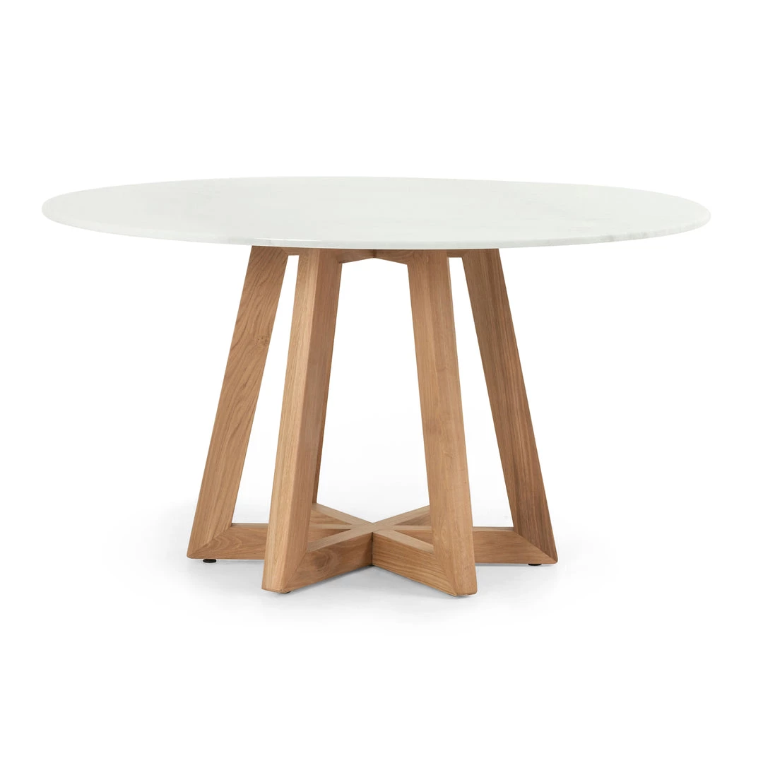 Scandinavian design aesthetic gives a beautifully fresh take on modern farmhouse style. An open, angular base of light honey-finished oak supports a rounded tabletop of white marble, for a clean, versatile look great for everyday dining.