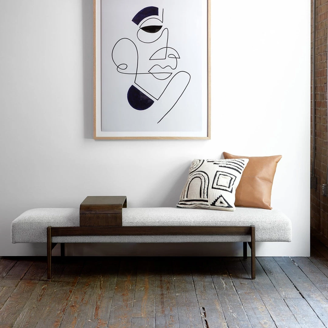 A uniquely modern statement piece inspired by the functional mid-century-style telephone bench, textural white-grey seating features a sliding tray of solid beechwood – the perfect place for a favorite book or cocktail. Great in the entryway or living room.