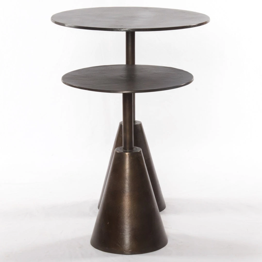 A pair of tables play with proportions while swirls of color add depth to the antique finish.