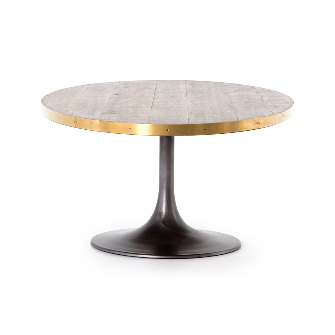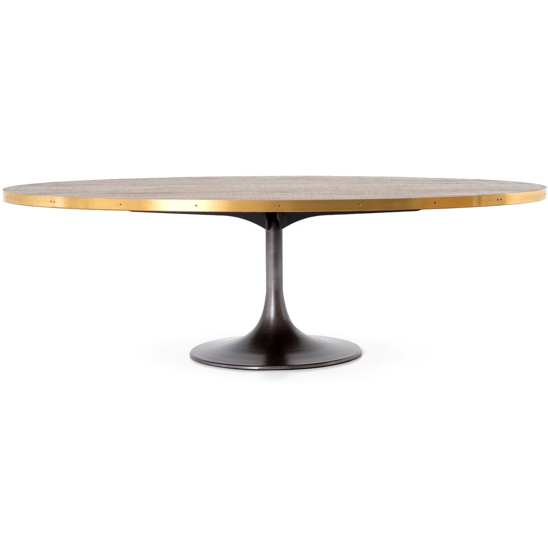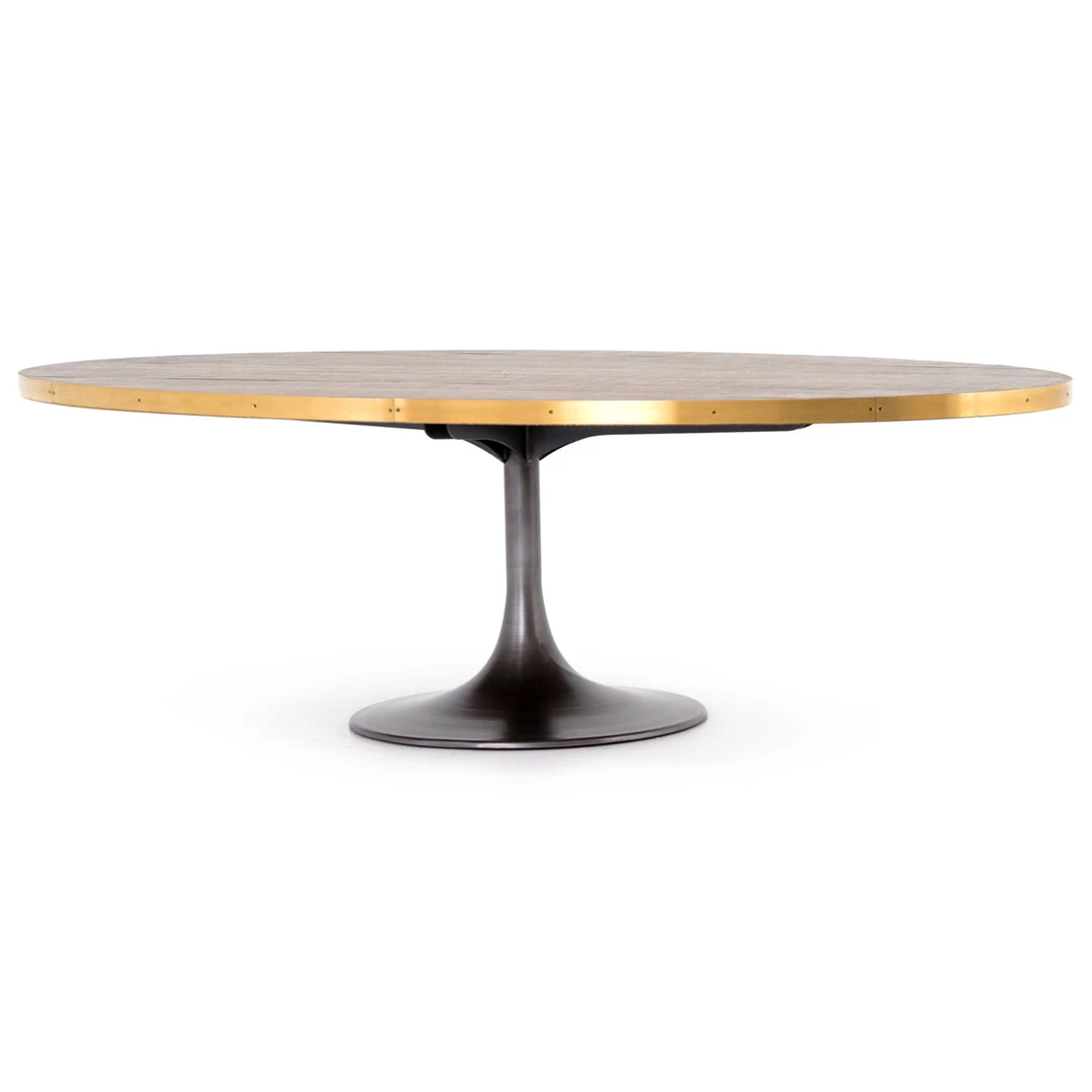 Mixed materials make the table. Classic tulip shaping is recast with a vessel grey iron base and a light, burnt oak oval top banded in polished brass steel with exposed nail heads.