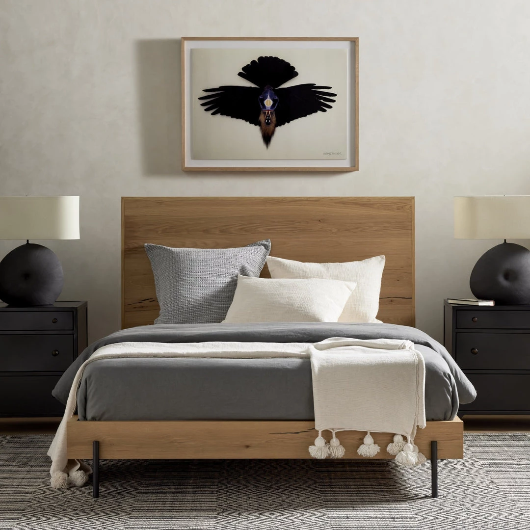 High style with organic vibes. Black resin fills in the natural cracks and graining of this cradle-base bed of beautiful oak. Subtle variance of resin placement and volume speak to design’s character-rich nature.