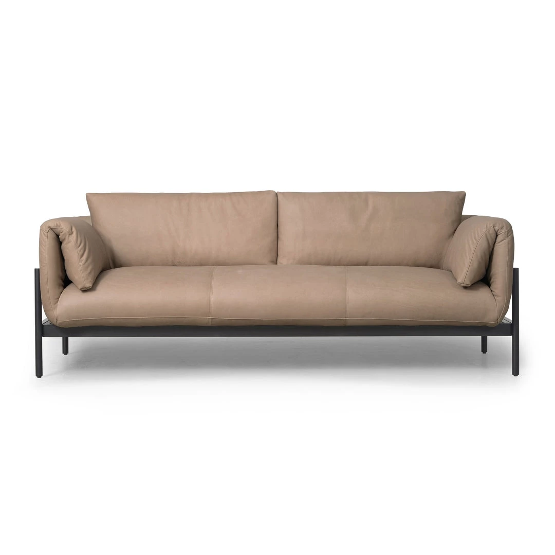 A softer, more modern take on a classic silhouette. Plush cushioning and unique foldover arm details are upholstered in our rich, buttery soft 100% top-grain leather. Matte iron base adds just the right amount of contrast.