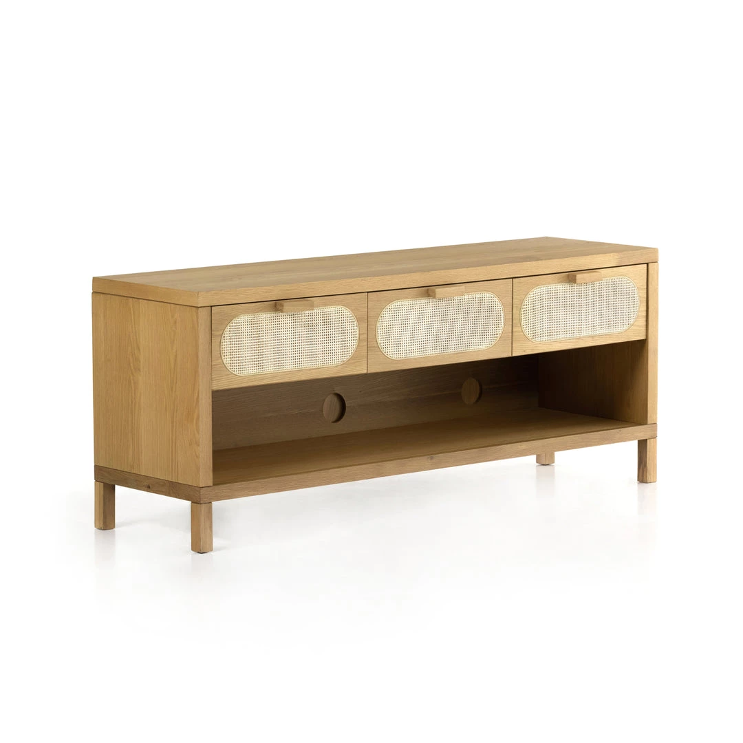 Au naturale. Honey-finished oak forms a clean-lined media console, with pill-shaped cane paneling bringing great texture to three roomy drawers. Rear cutouts for cord management.