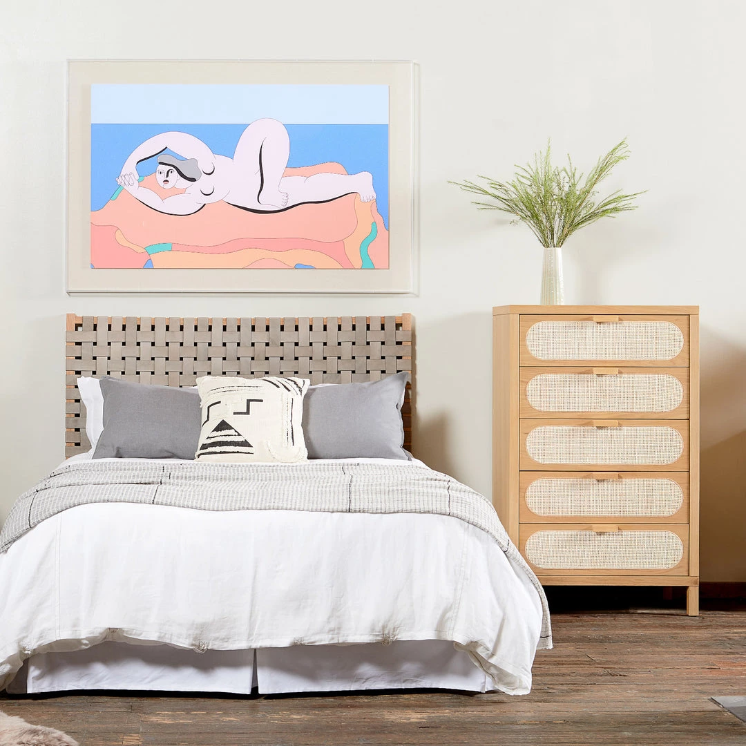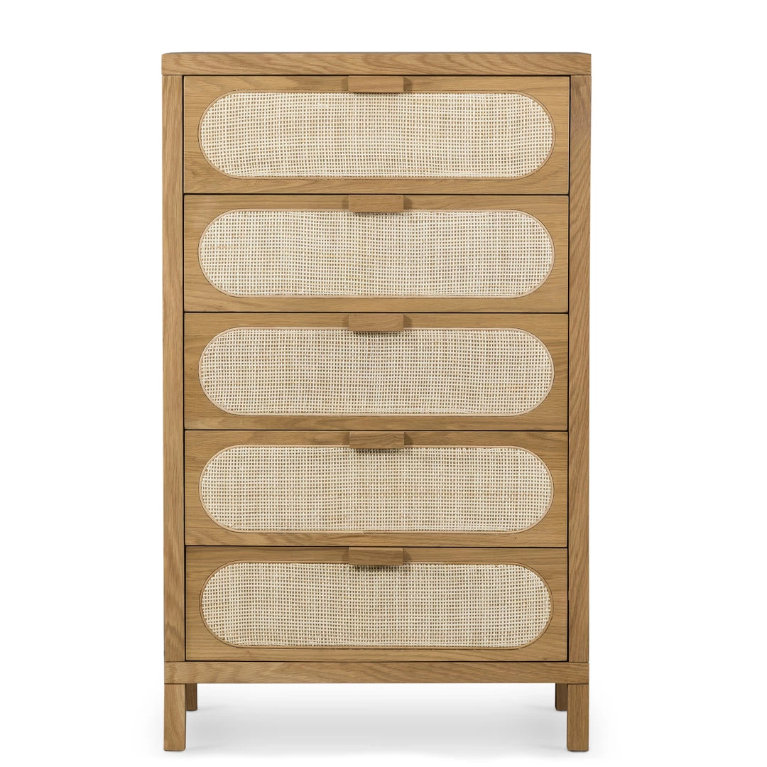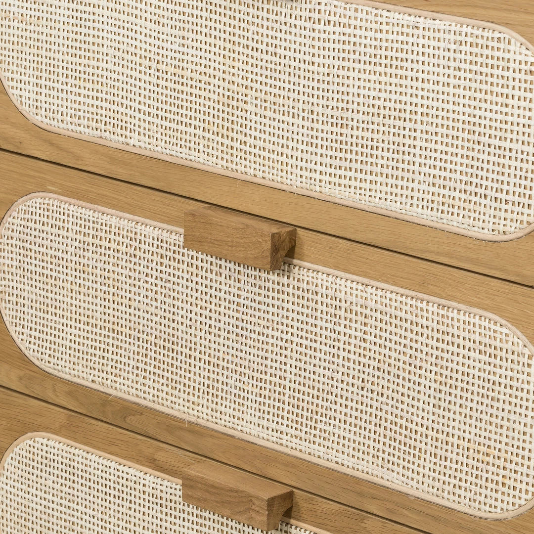 Au naturale. Honey-finished oak welcomes eight spacious drawers with wood-backed cane paneling, for a soft, neutral look with lasting modernity.