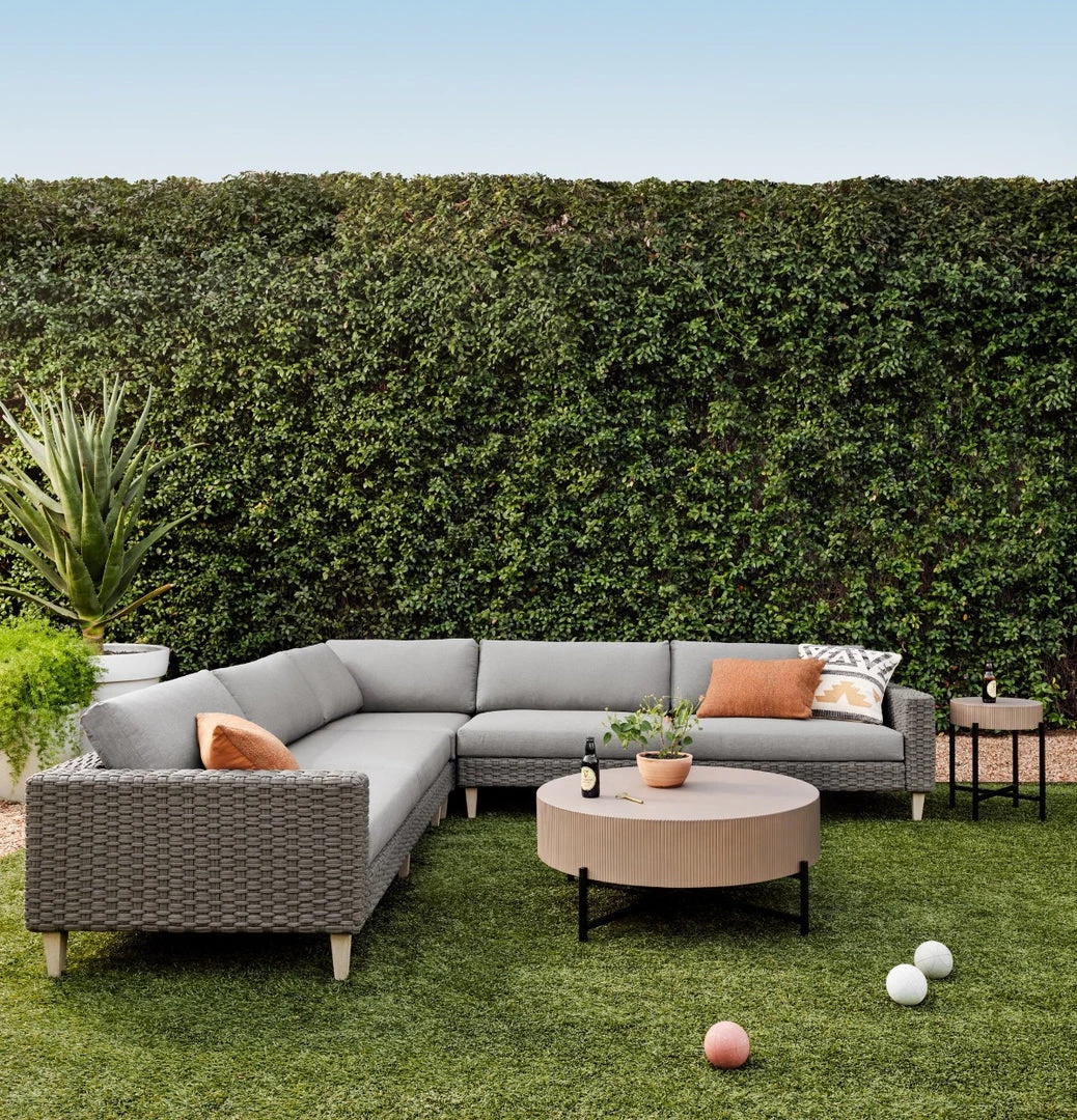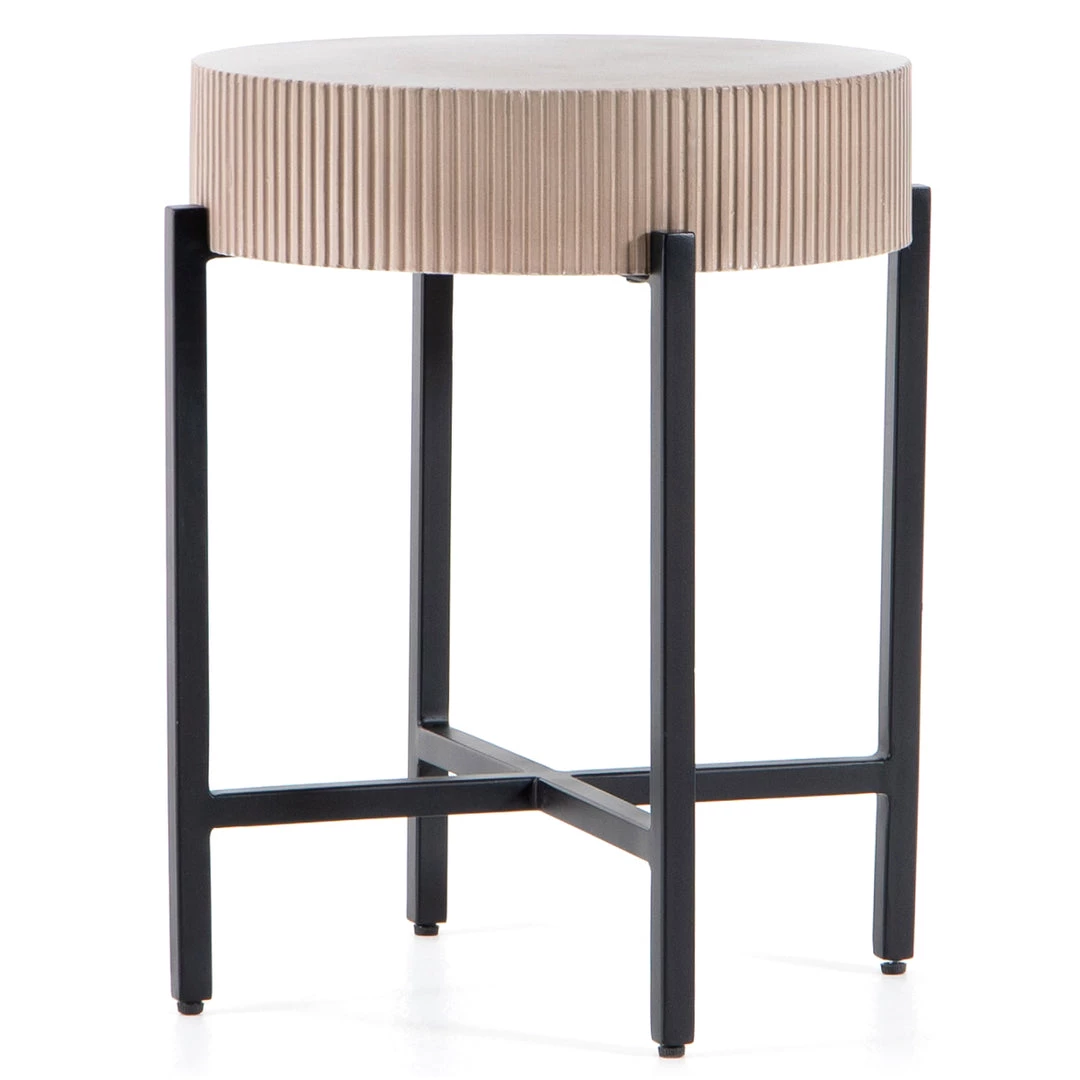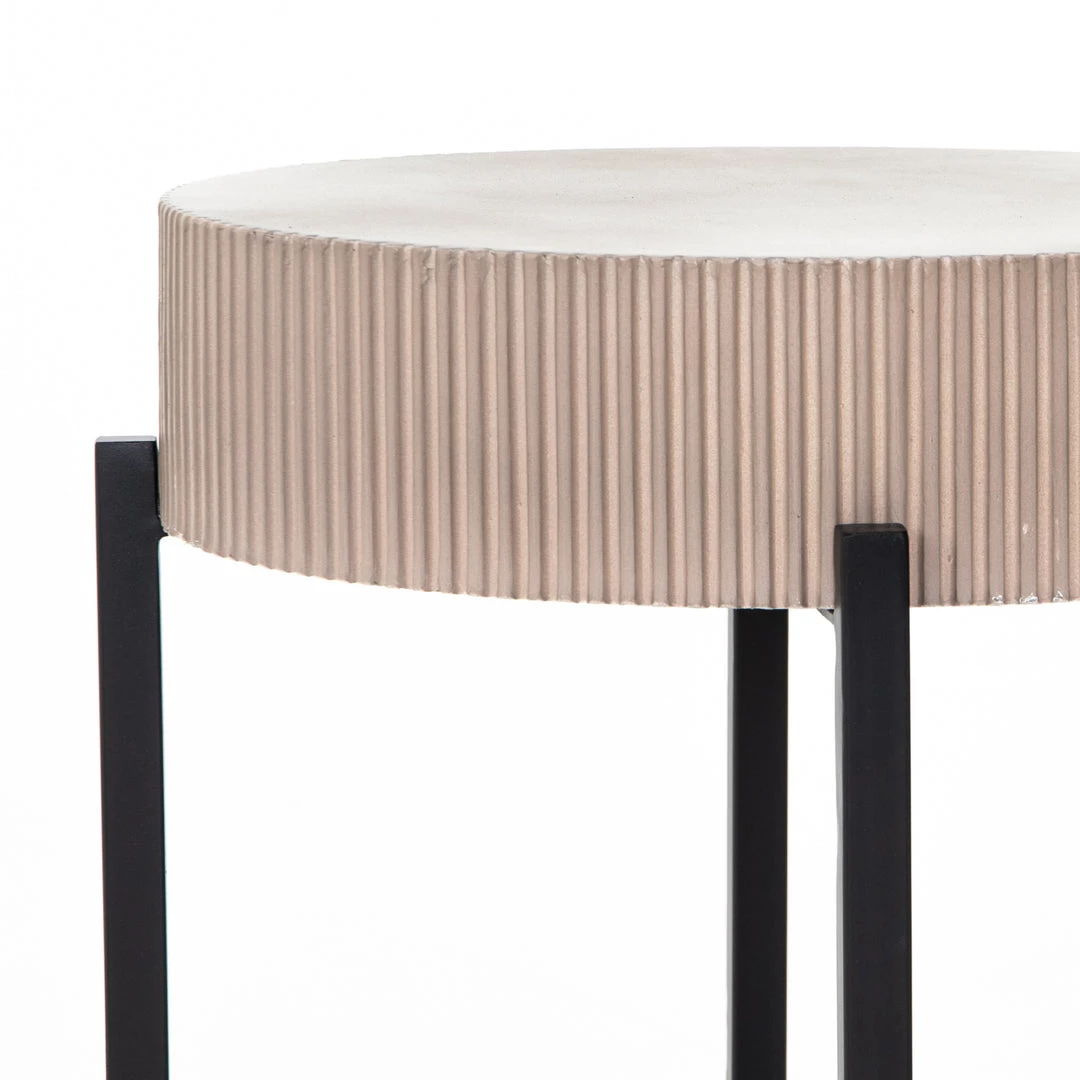 Side reeding lends texture to a petite end table of taupe concrete, while low, black steel framing spurs an intriguing juxtaposition of scale. Cover or store inside during inclement weather and when not in use.