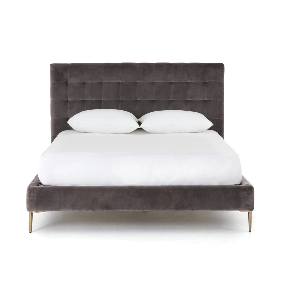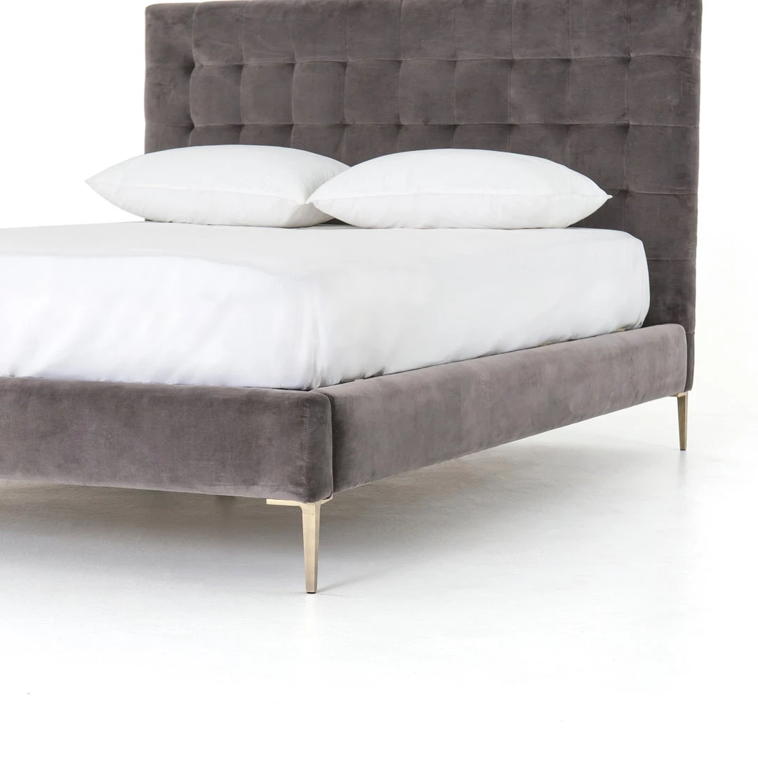 Bring simple elegance to the bedroom. Velvety grey cotton covers this low-styled bed, with button tufting for texture. Antique brass-finished legs add a hint of modernity.