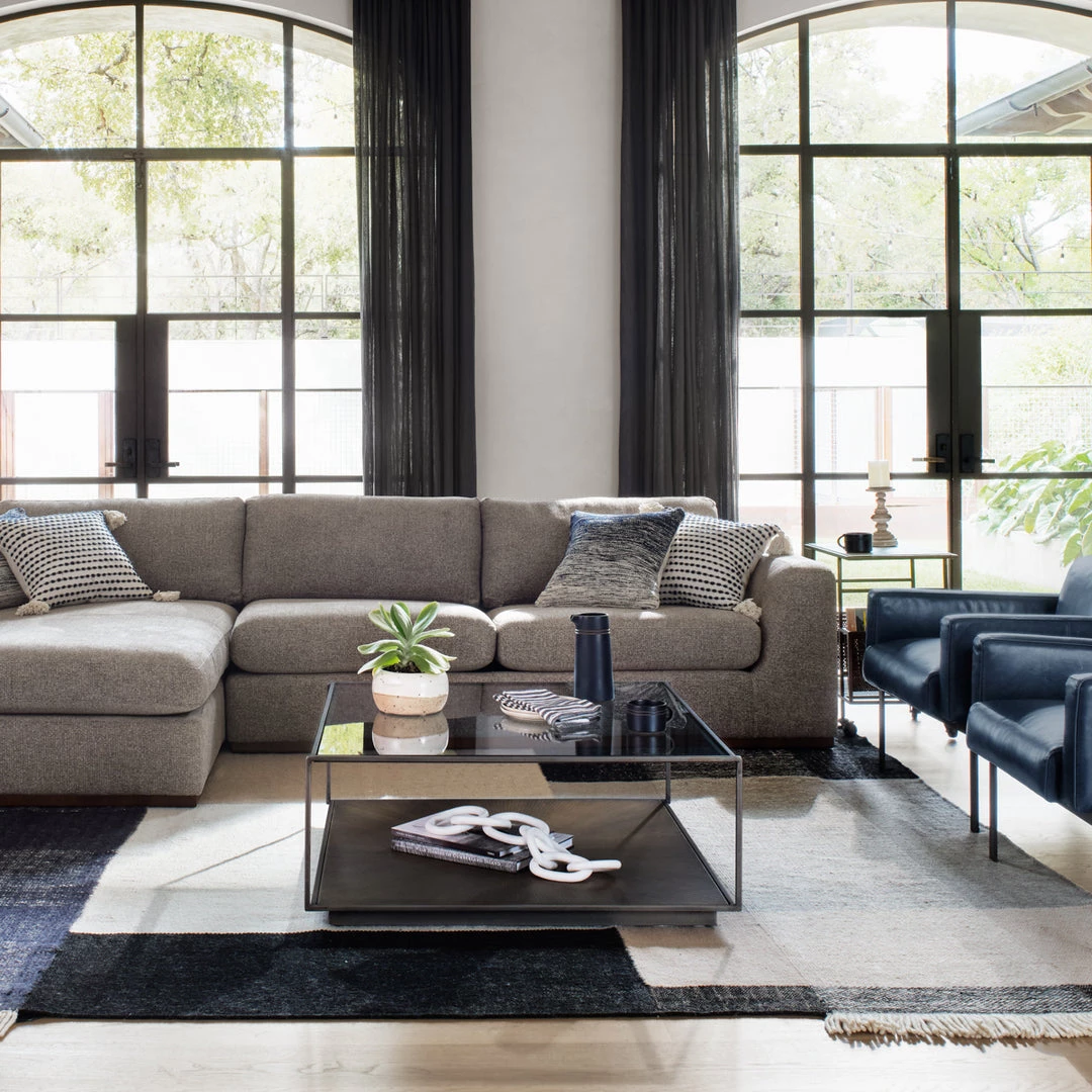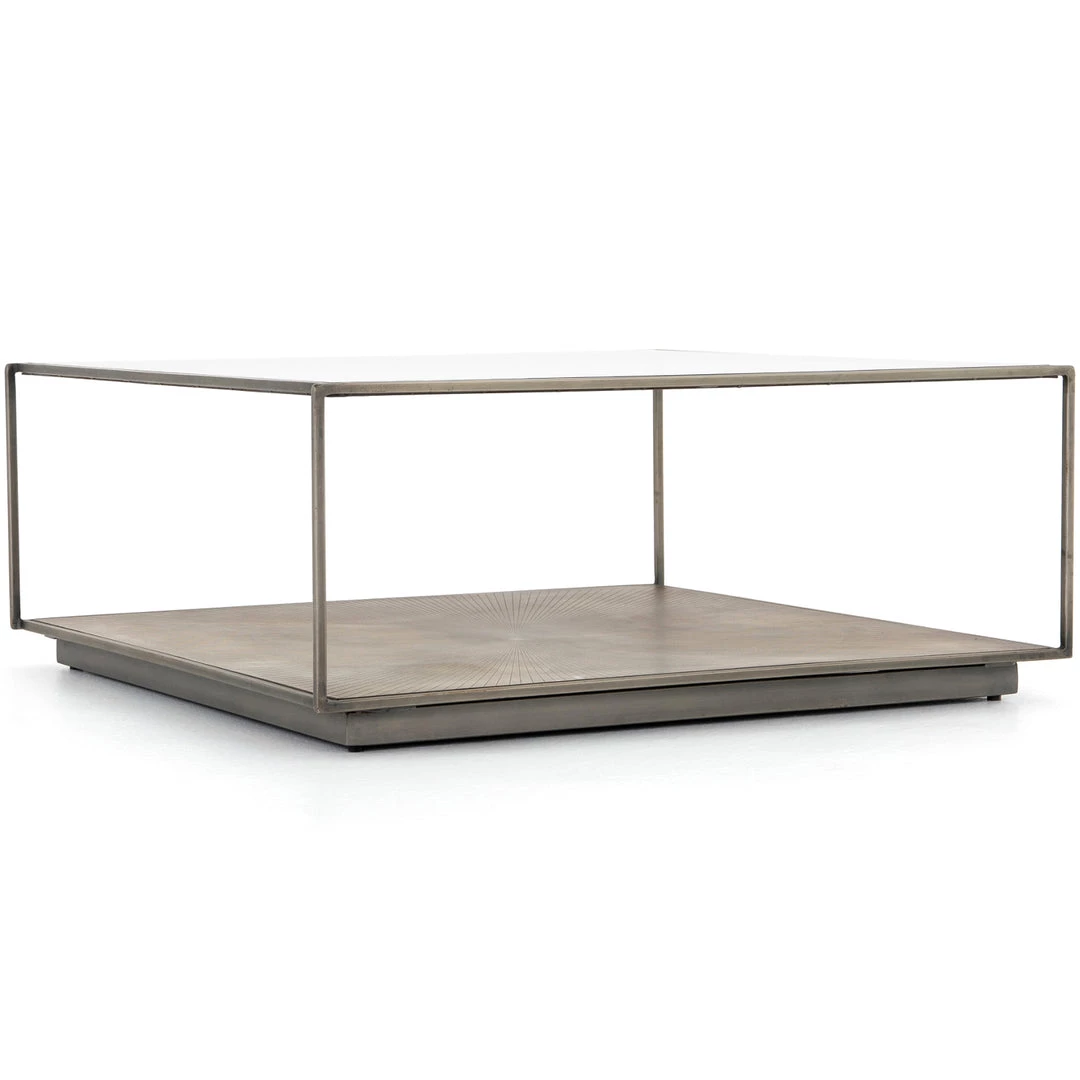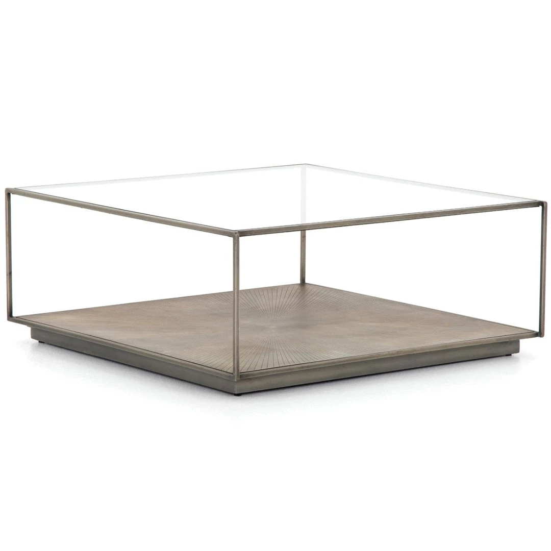 A shadowbox-style coffee table clears the way for your inner collector. Display décor and prized possessions within a glass enclosure of antique nickel-finished iron framing and brass lower shelf with an eye-catching etched sunburst pattern.