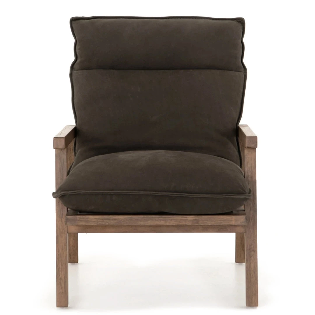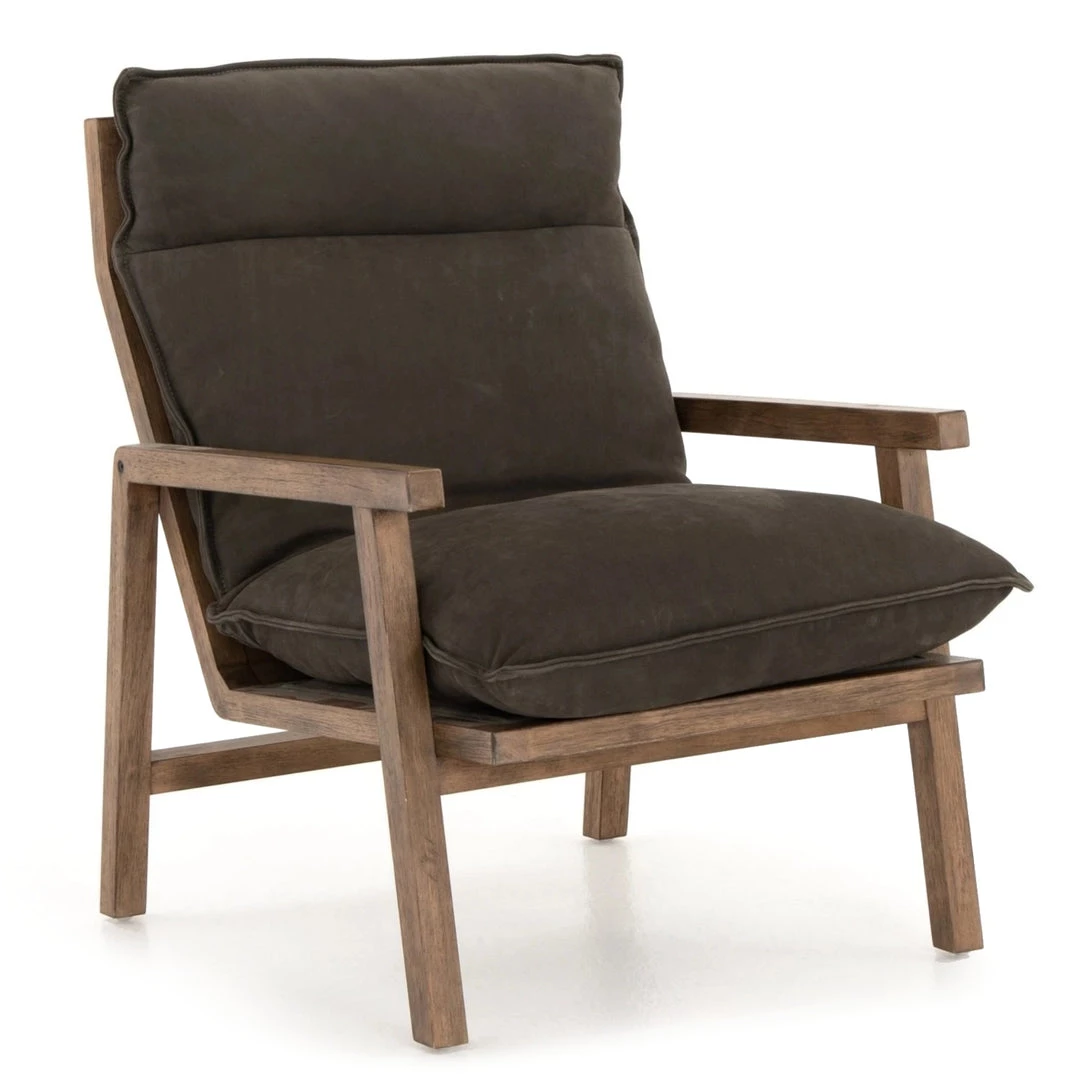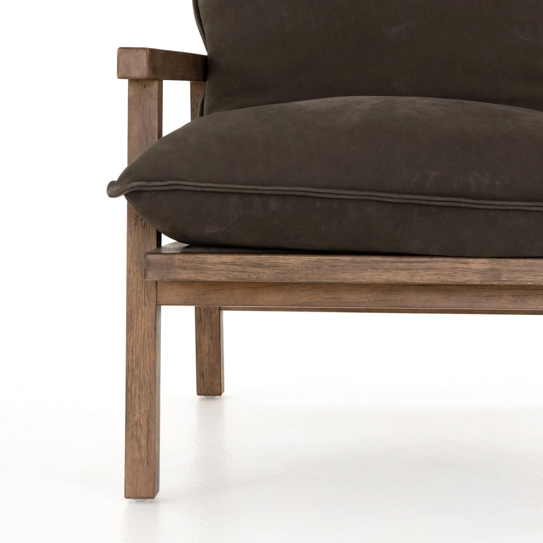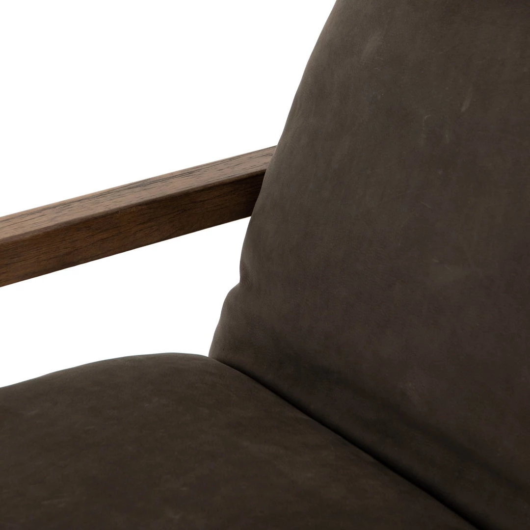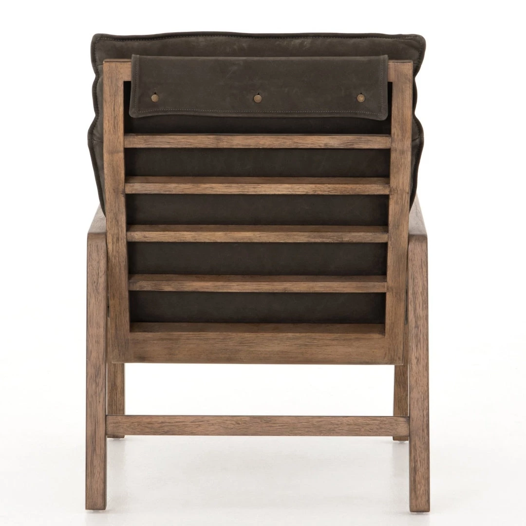 Inspired by the functionality and simplicity of Scandinavian style. Antique walnut finished parawood framing with ladder-back detail and a charcoal-colored top-grain leather flange edge cushion come together to create this super stylish, effortlessly cool seat.