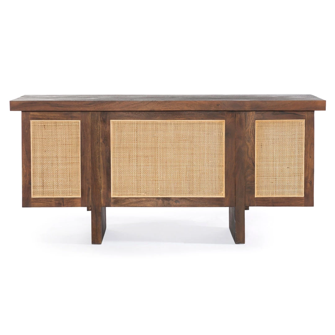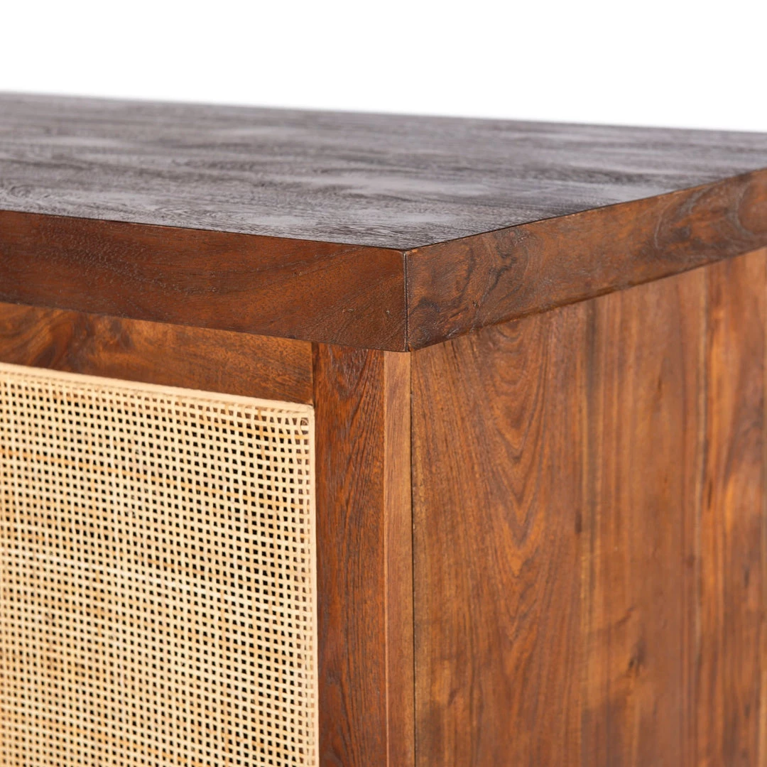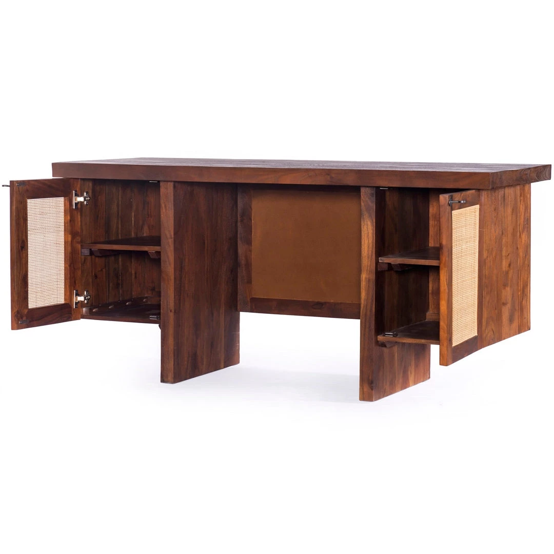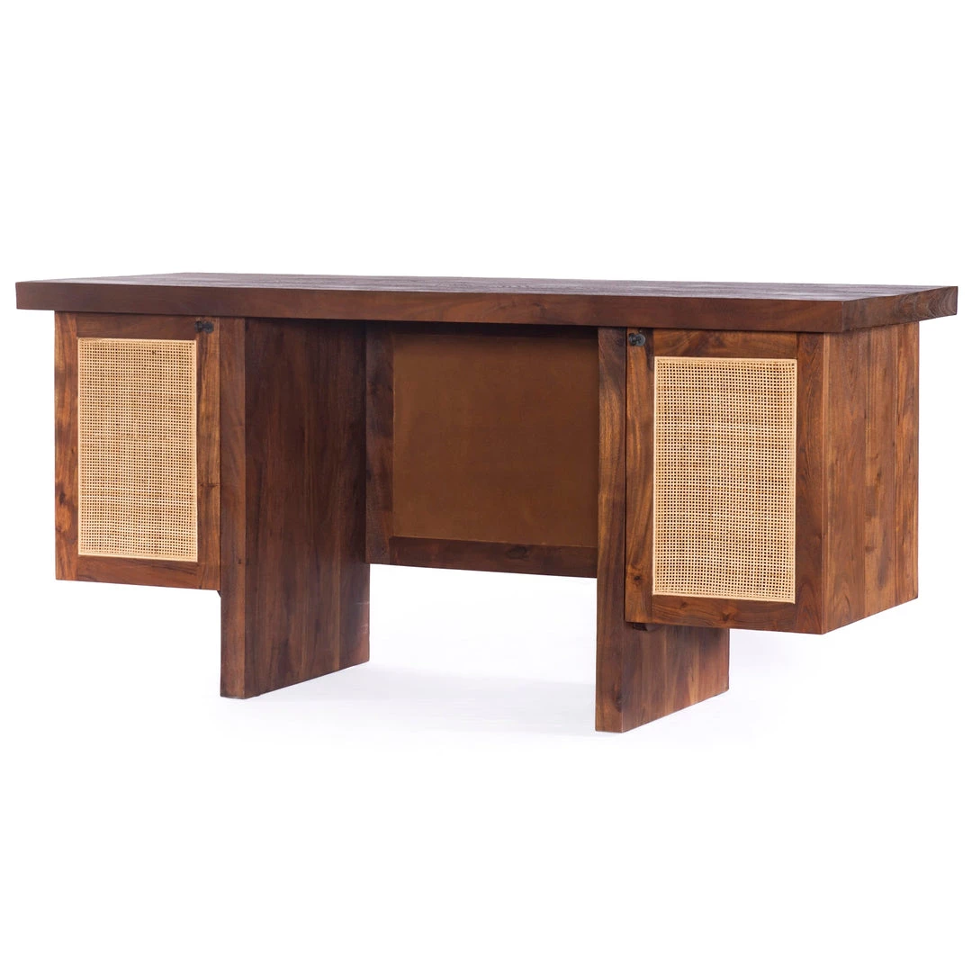 Mid-century inspiration at its finest. Chunky, inset legs of toasted acacia ground a linear desk featuring natural cane door fronts, for a fresh, textural twist. A removable faux locking key reimagines traditional hardware into something entirely novel. Three spare keys included.