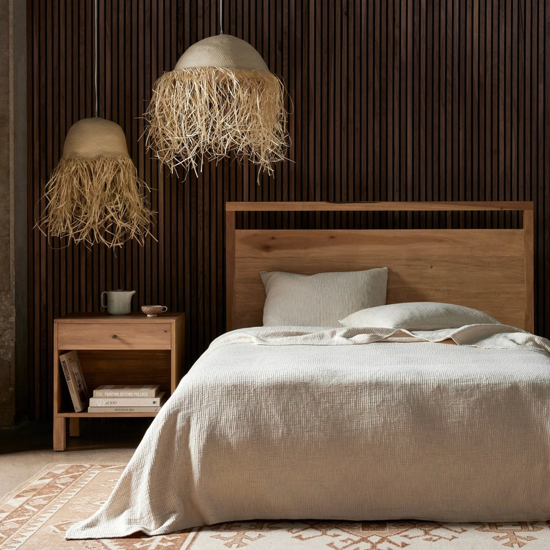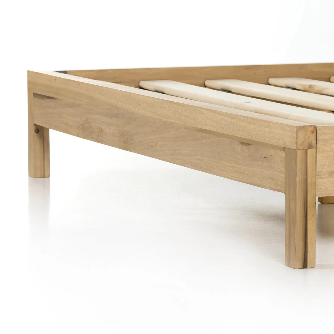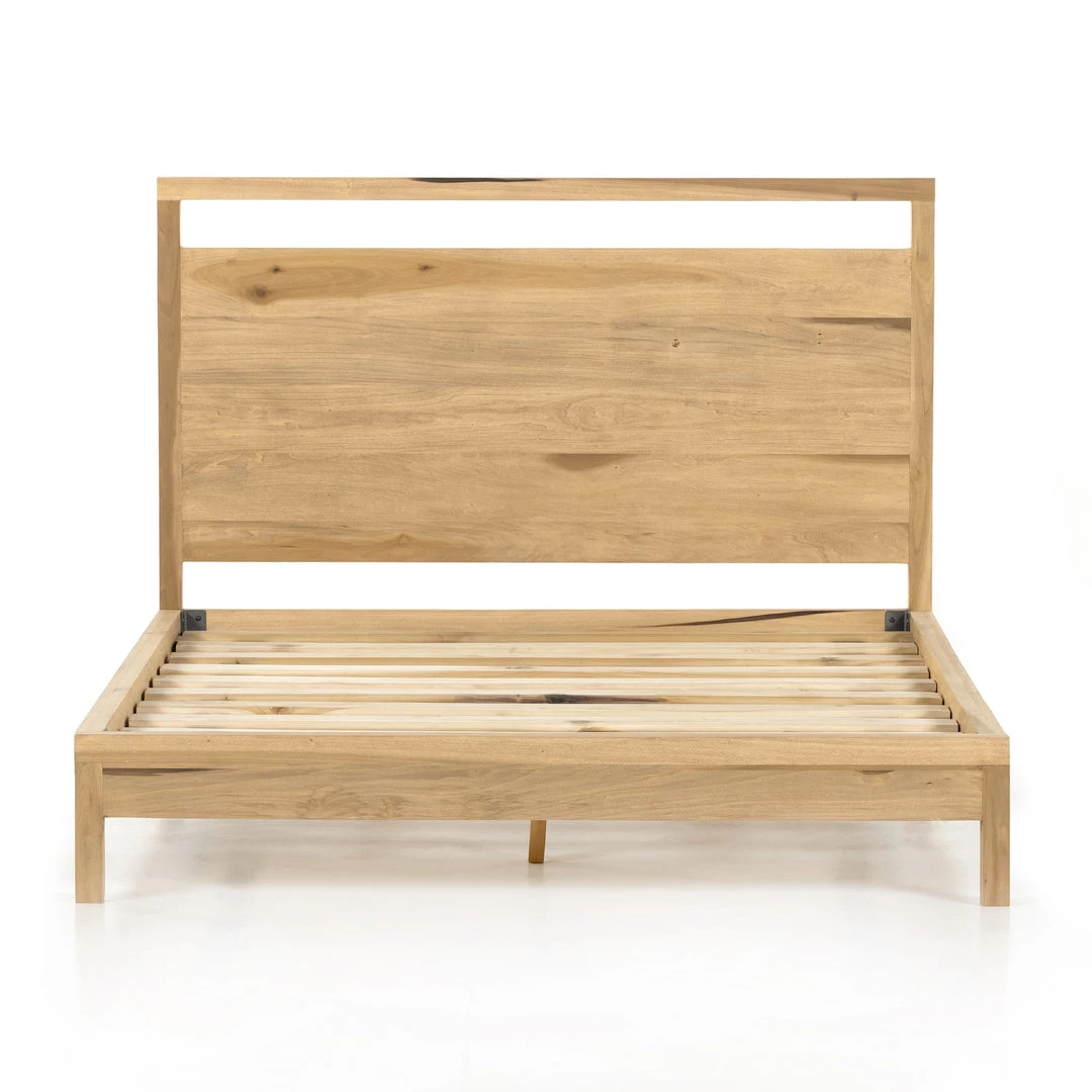 Dry-washed poplar forms a simple Shaker-inspired bed, with a horizontal cutout for a light, linear look.