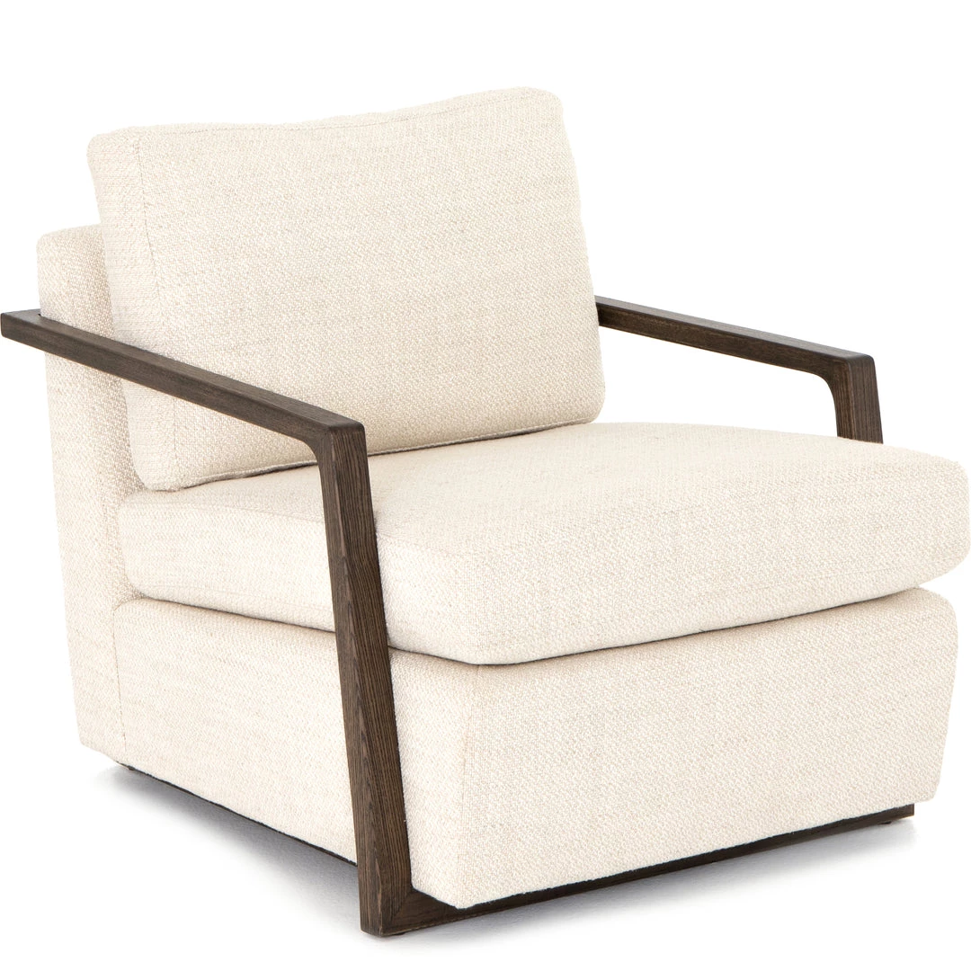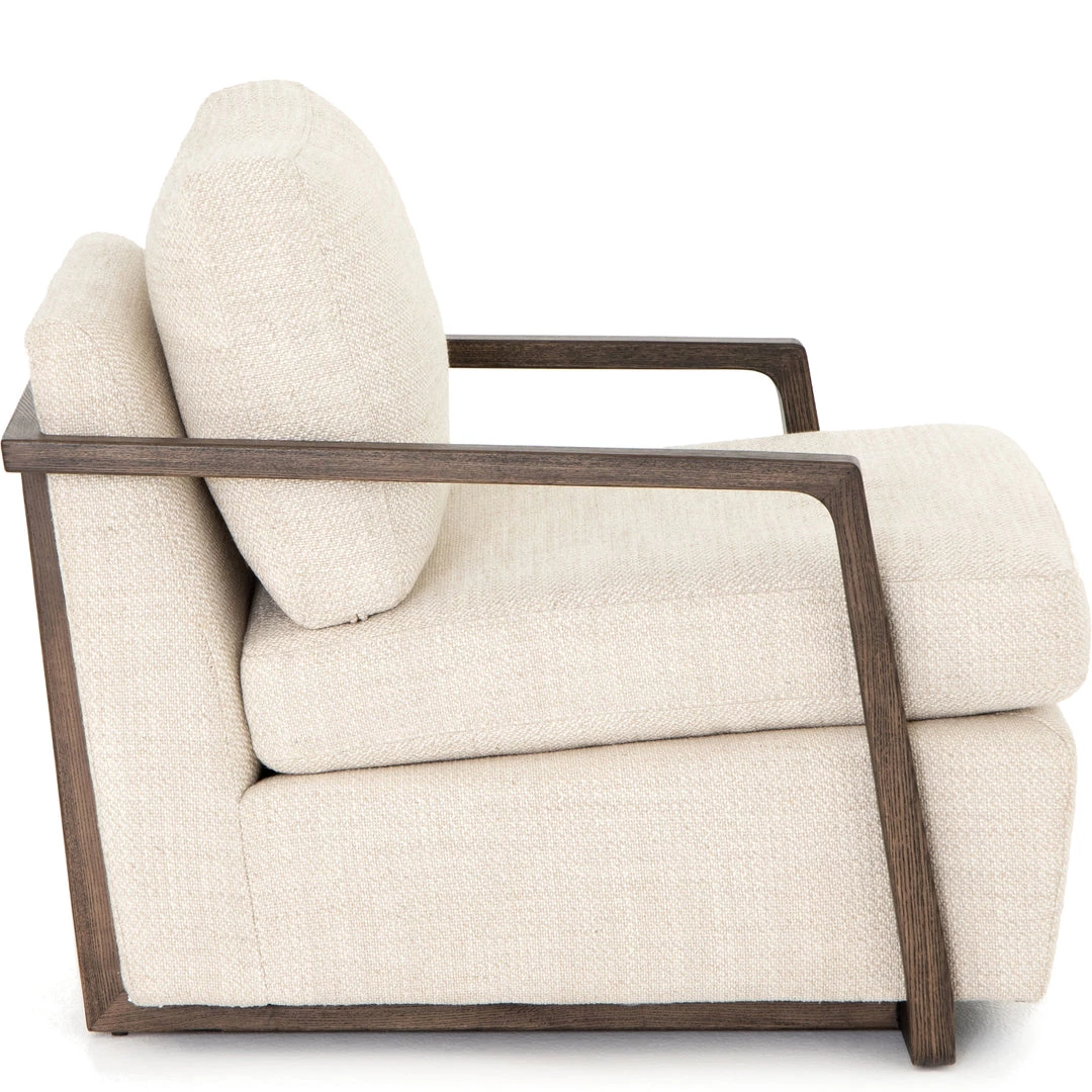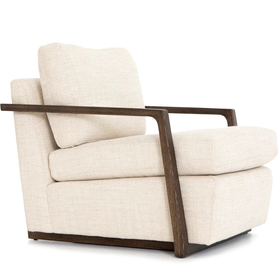 Slim brown oak framing wraps the silhouette of casual yet sophisticated performance-grade seating, perfectly durable for daily lounging.