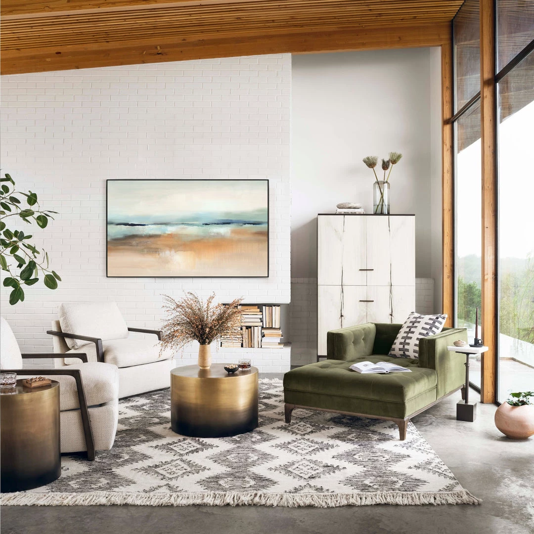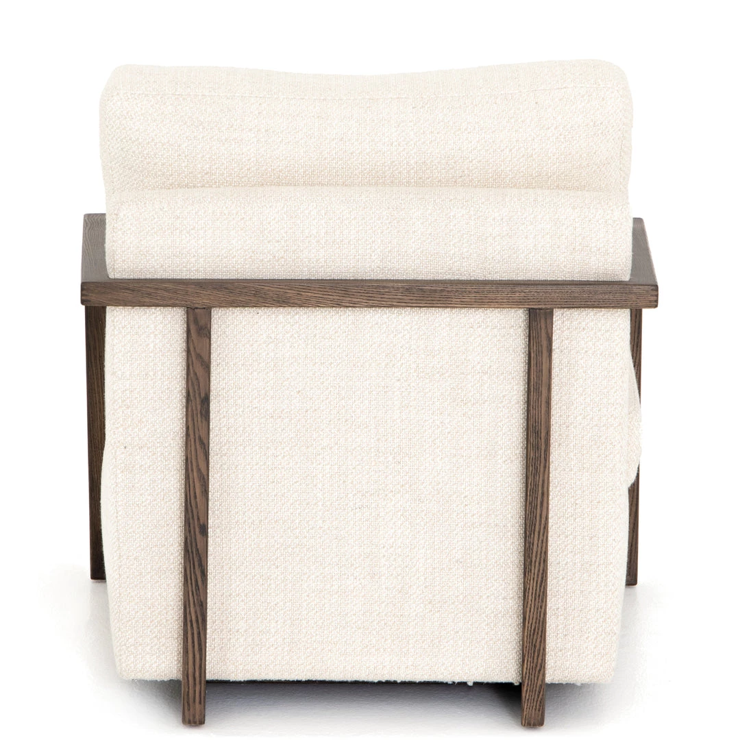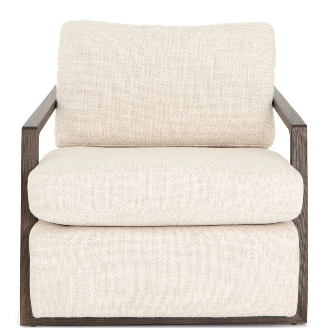 Slim brown oak framing wraps the silhouette of casual yet sophisticated performance-grade seating, perfectly durable for daily lounging.